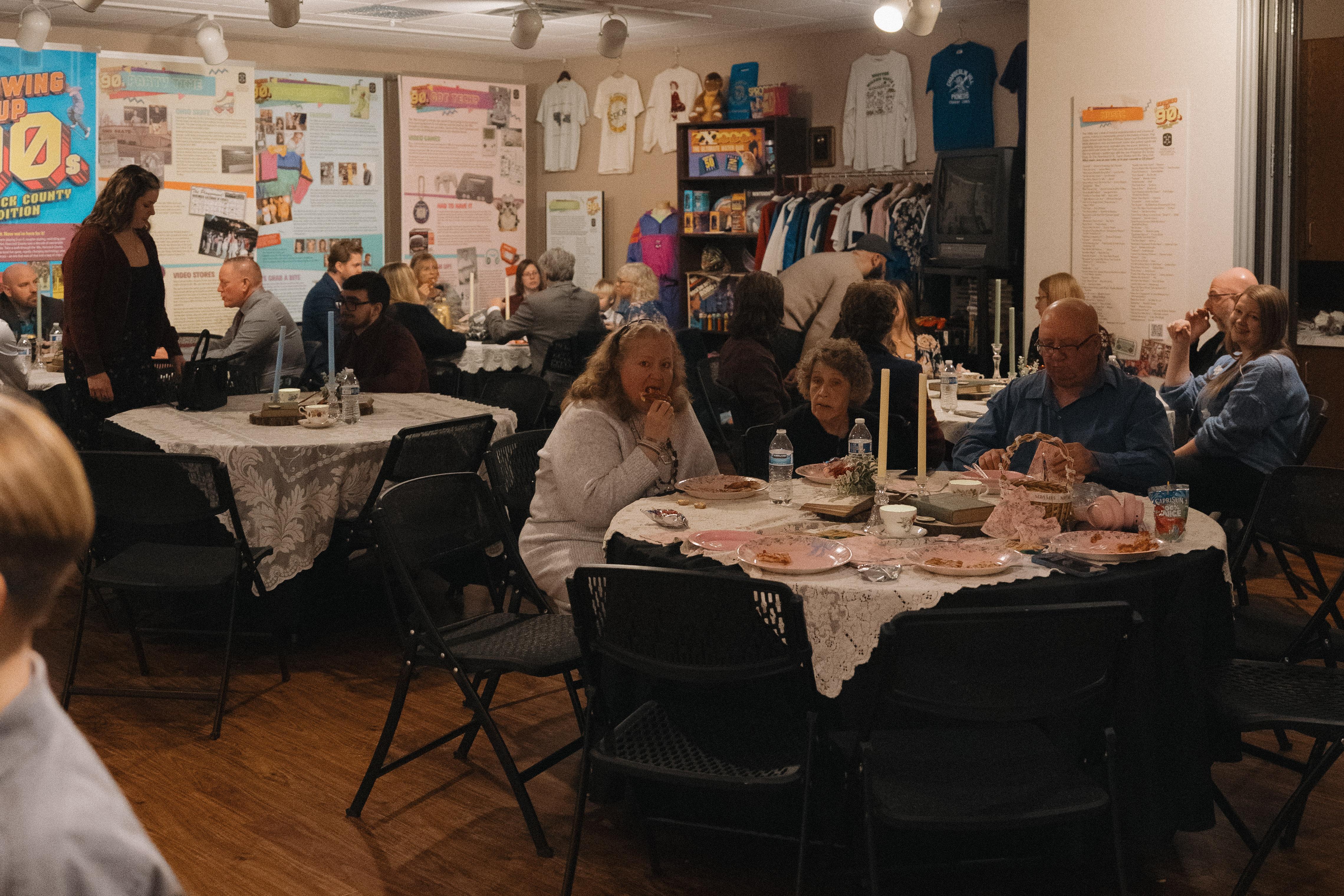 The Community Room features warm wooden floors and a relaxed atmosphere, highlighted by a fun 1990s-themed exhibit that adds a unique touch of nostalgia. The space connects directly to the museum galleries, allowing guests to easily explore exhibits and enjoy the surrounding historic campus during your event.