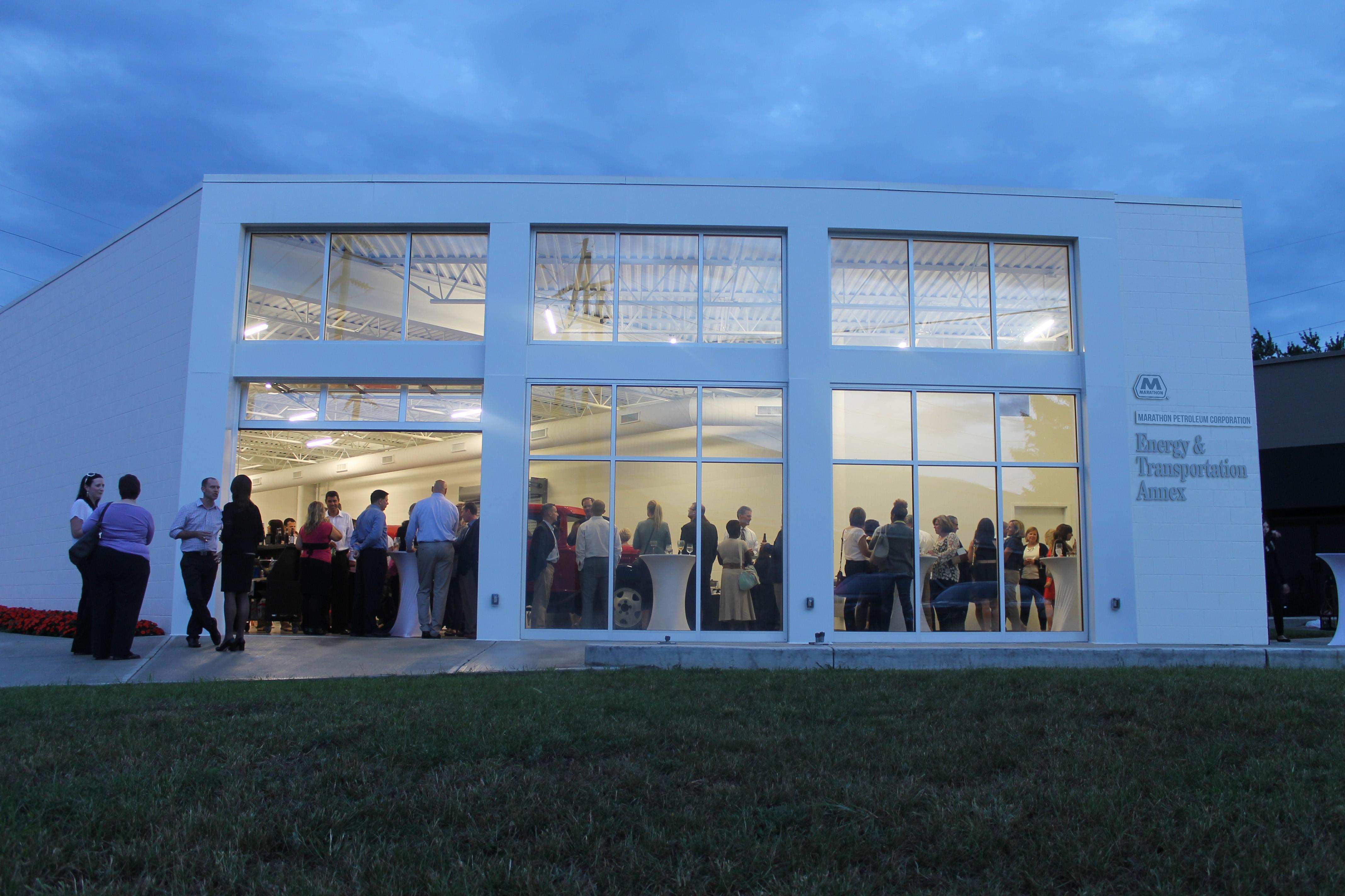 The MPC Energy & Transportation Annex features vaulted ceilings, large ceiling fans, and a garage door that opens to the patio and Heminger Garden for a seamless indoor-outdoor flow. Guests celebrate among rare exhibits, including three Grant Motor Company cars, one of the world’s only surviving Adams trucks, and displays highlighting Findlay’s industrial legacy with companies like Marathon and Goodyear.