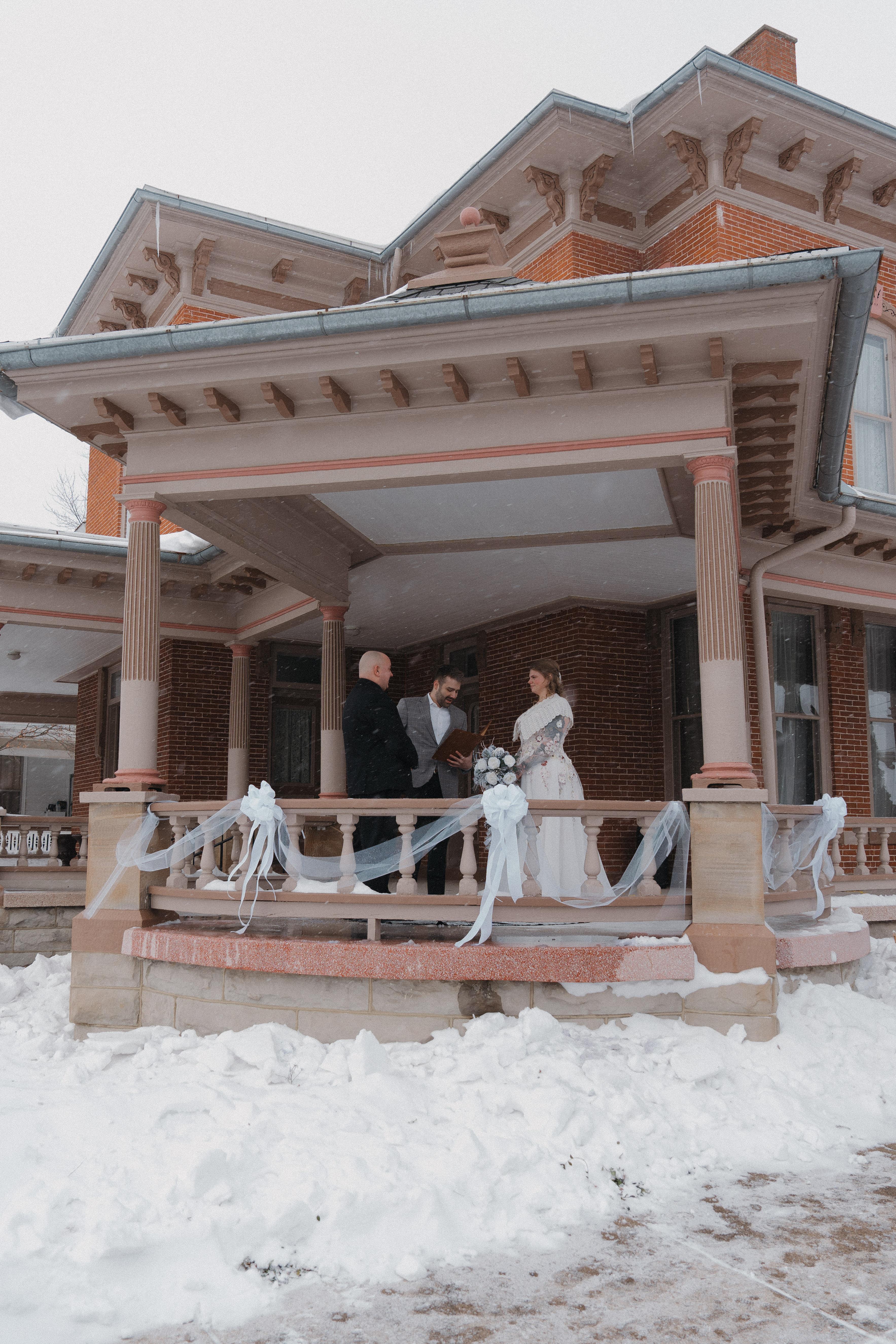 Celebrate on the elegant front porch of the 1881 Hull-Flater House—an iconic Victorian backdrop perfect for intimate gatherings and timeless photos.