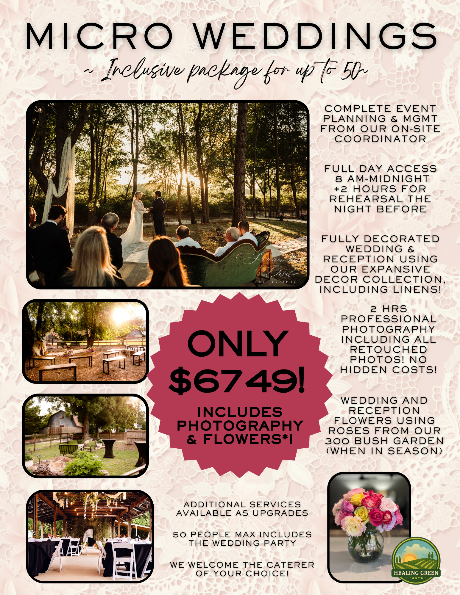 Healing Green Farms is a beautiful venue! The surroundings are serene, from the beautiful sunsets over the farm to the rustic beauty of the barns. This venue is a pleasure to work with in all aspects. My clients love the affordability and the options the farm offers for different ceremonies. The possibilities are endless! If you are looking for a wedding that is beautiful, relaxing and one of a kind, then Healing Greens Farm is the place. Also your four legged friends are able to come for the special day. I would highly recommend Healing Greens Farm to any of my clients looking for the biggest bang for their buck.