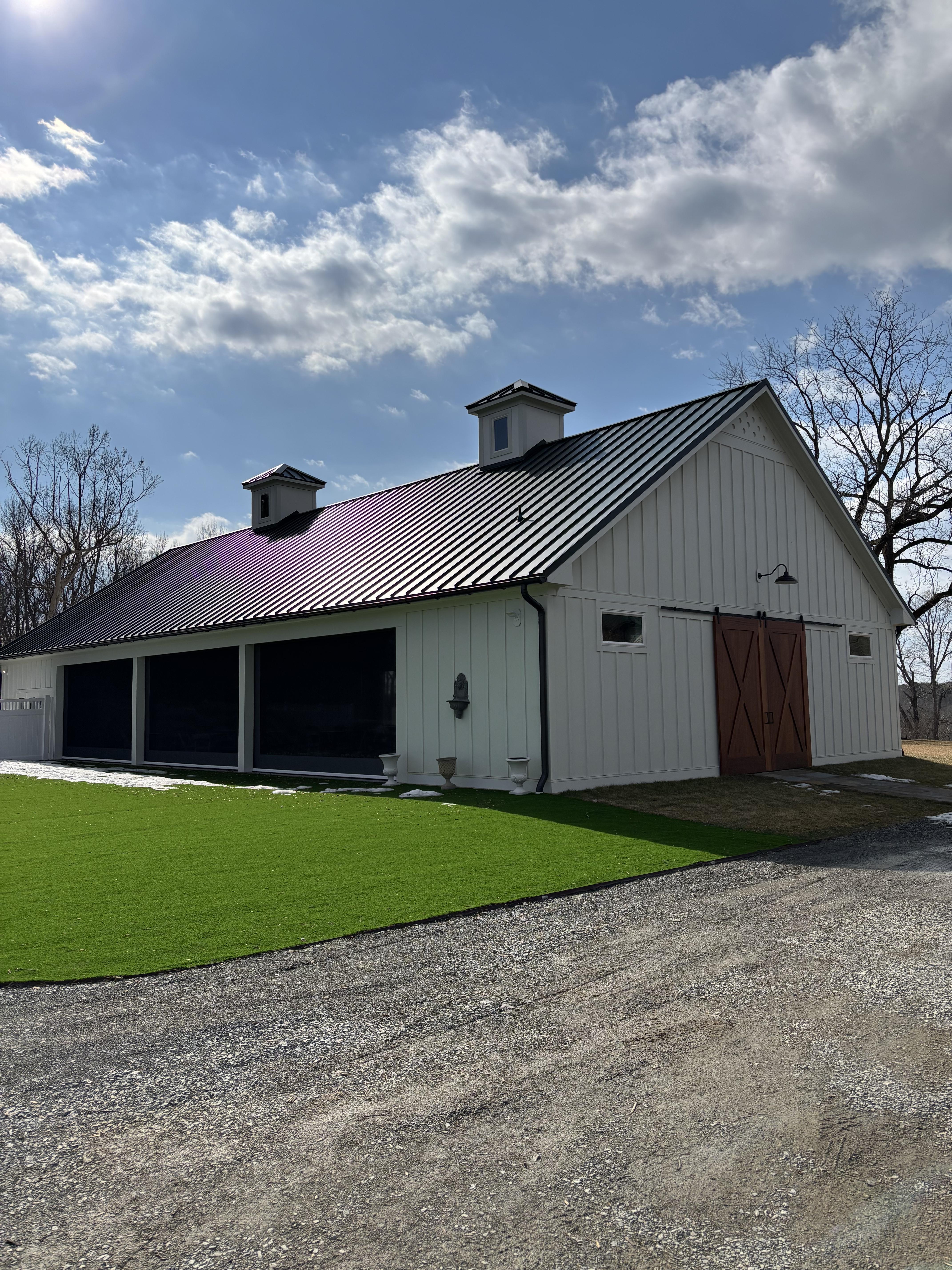 Tables and chairs, flooring that does not require a dance floor, catering kitchen, bathrooms, siding that can come up and down to give you a more open look or keep it closed off. Turf on one side with chairs and lawn games.