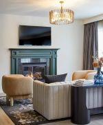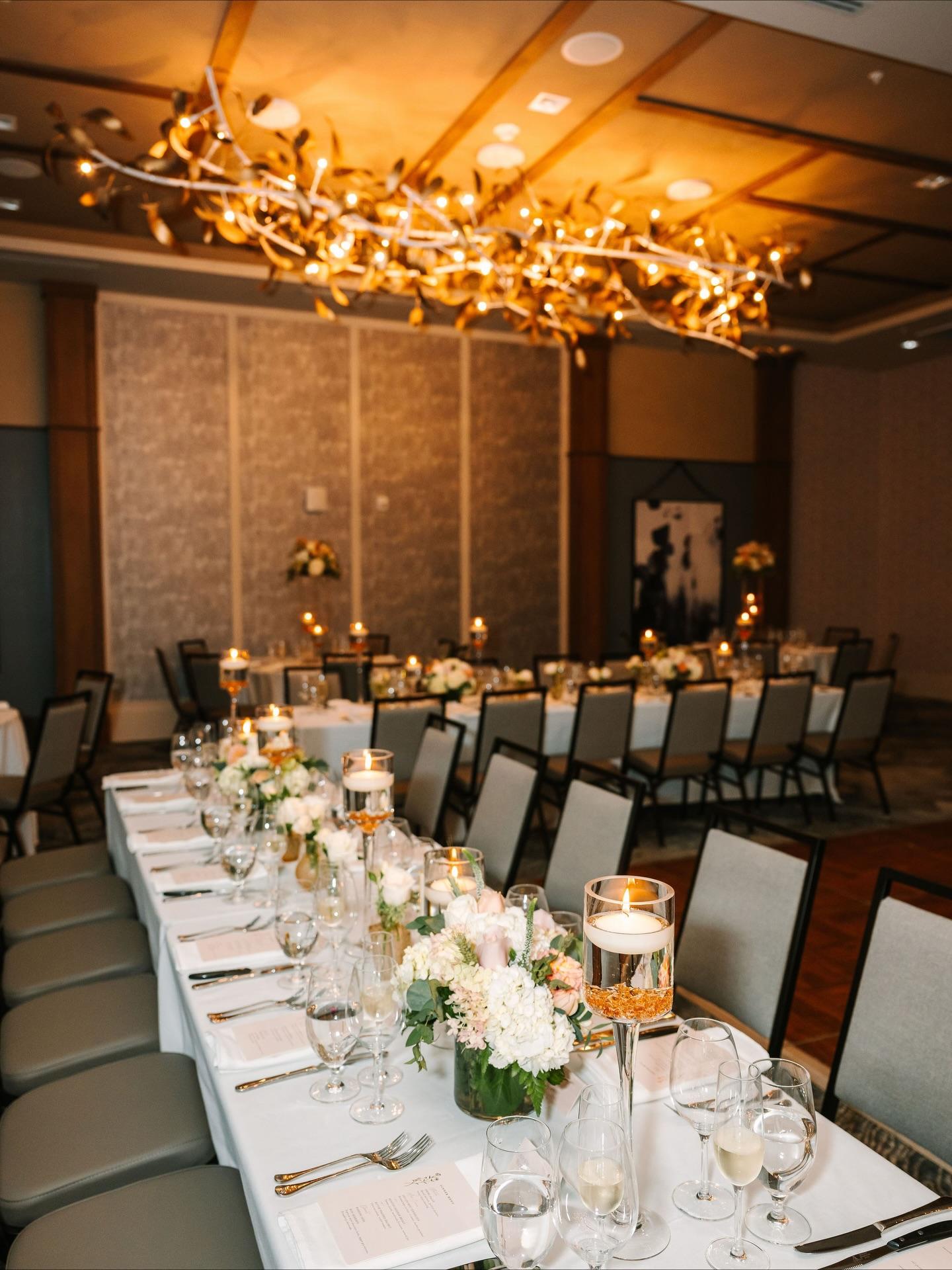 The Brookmere Ballroom is a masterclass in modern elegance, defined by its sophisticated neutral palette and striking architectural lighting. The room’s centerpiece is a massive, organic branch-inspired chandelier finished in warm gold, which casts a radiant, artistic glow over the entire celebration. Wrapped in soft slate-blue and cream-textured walls with rich wood pilasters, the space features contemporary abstract art and sleek, slate-grey seating that perfectly balances upscale luxury with a clean, editorial aesthetic.