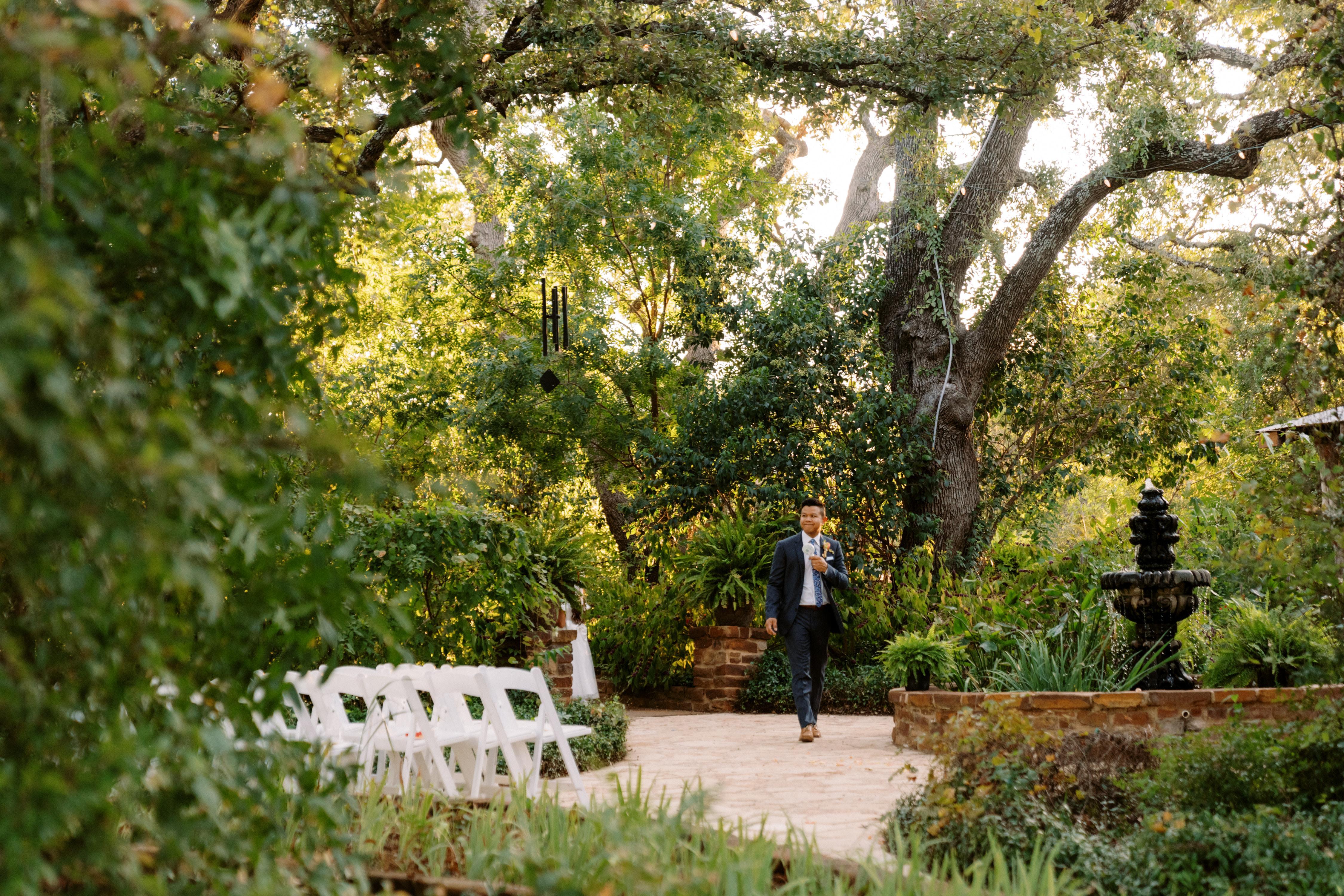 Shaded by towering trees, it offers cool breezes, the gentle sound of a koi-filled fountain, and lush, botanical-garden surroundings. Ideal for intimate ceremonies of up to 40 guests, the Courtyard also serves as an inviting cocktail-hour transition space and a beautiful backdrop for portraits.
