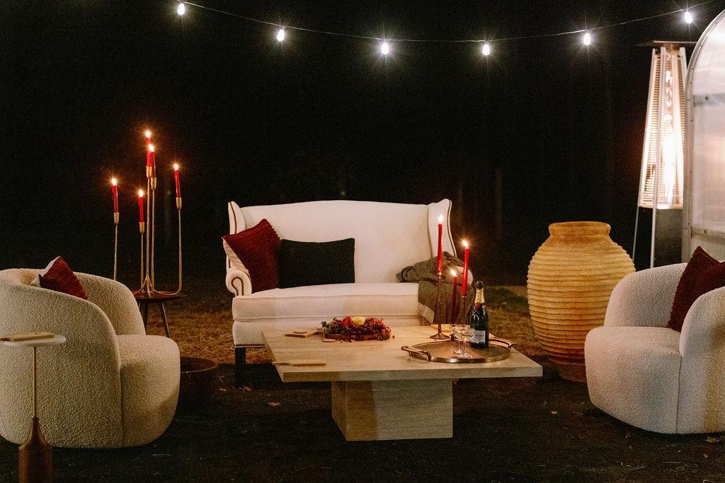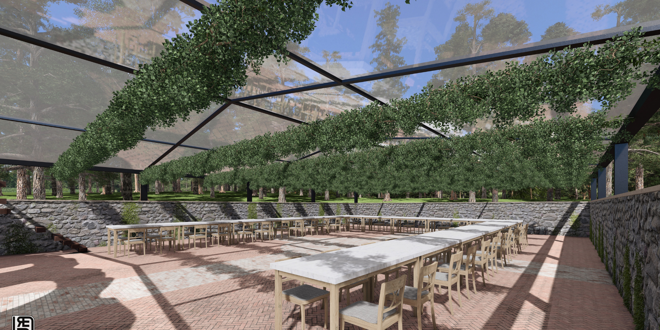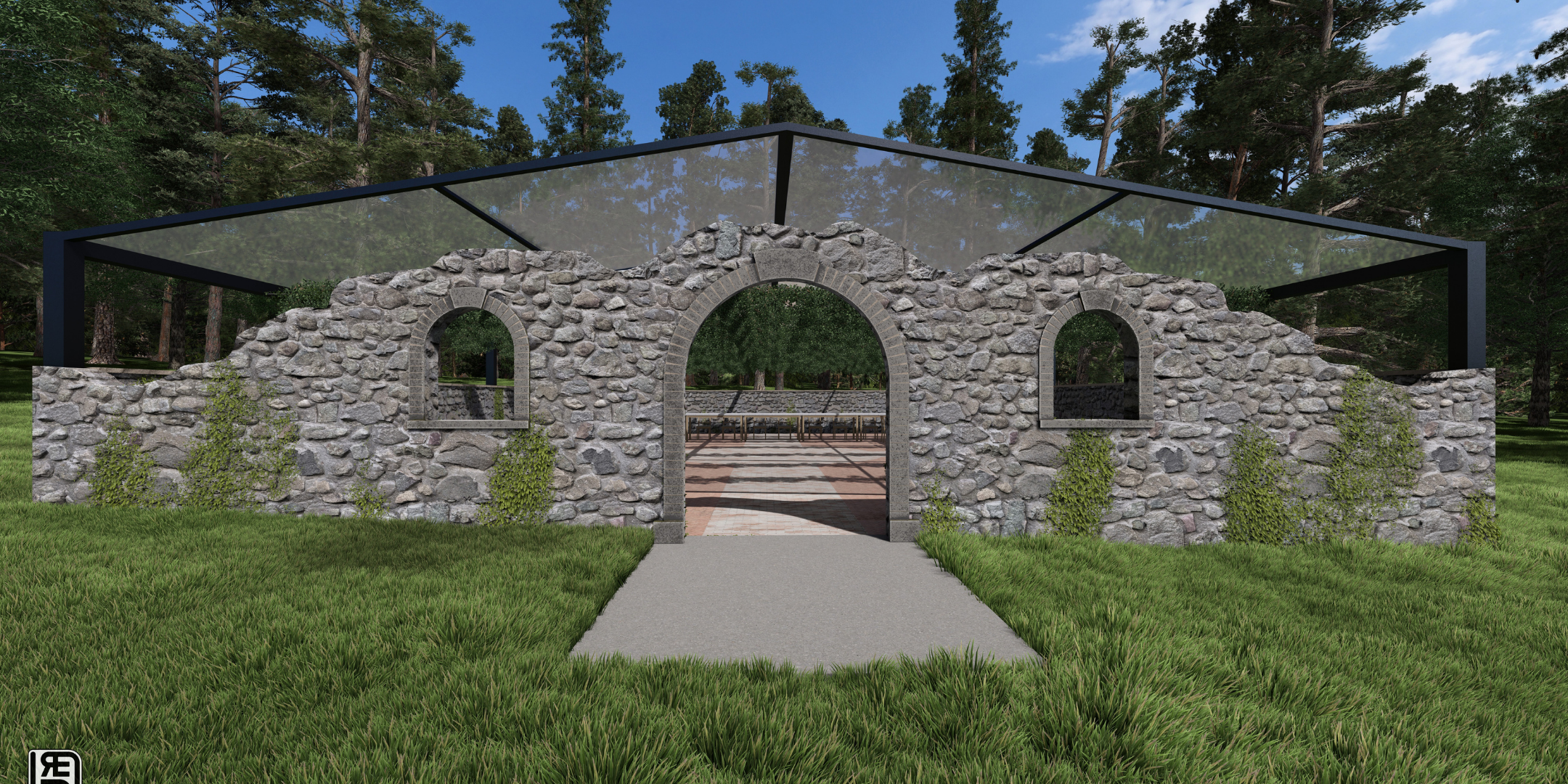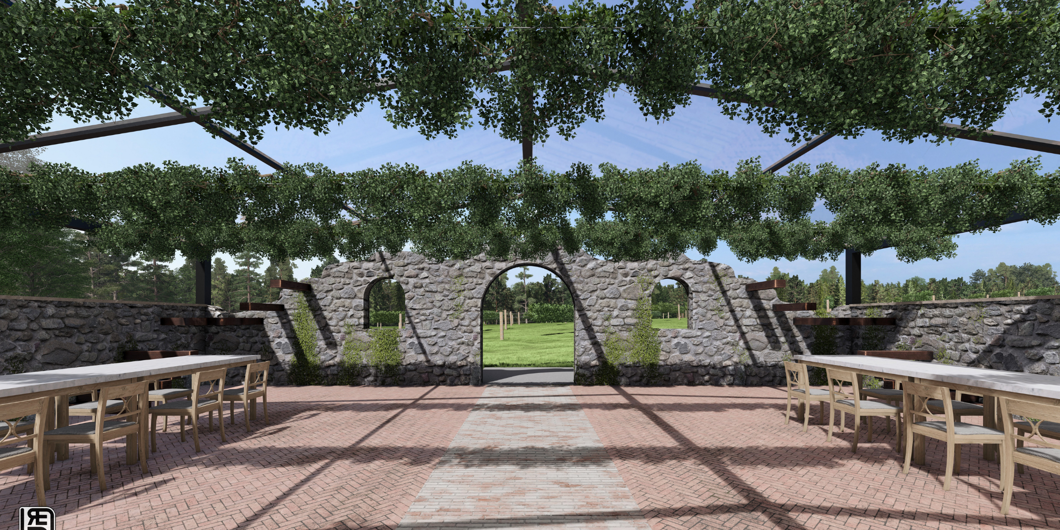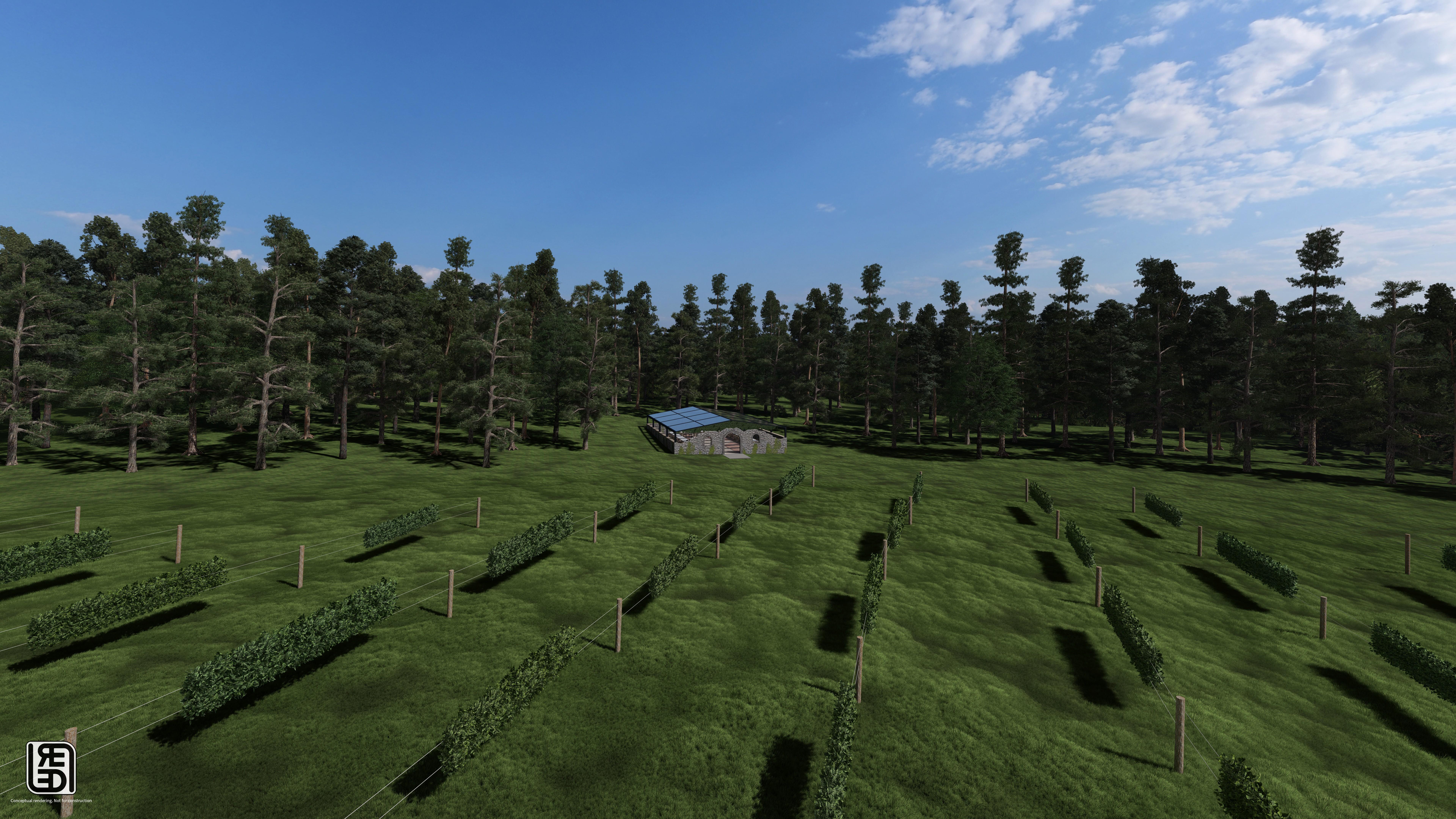 A picturesque oasis anchored by European inspired stone ruins and the iconic Sentinel Tree, surrounded by vines and forest. Perfect for romantic outdoor ceremonies and tented celebrations with a timeless feel. Architectural renderings help reflect our vision as the stone ruins come to life March 2026.