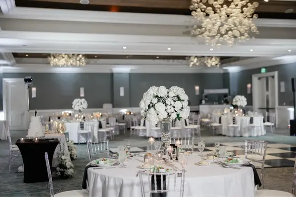 Traditional elegance, high coffered ceilings, and stunning chandeliers create the perfect setting for an unforgettable celebration