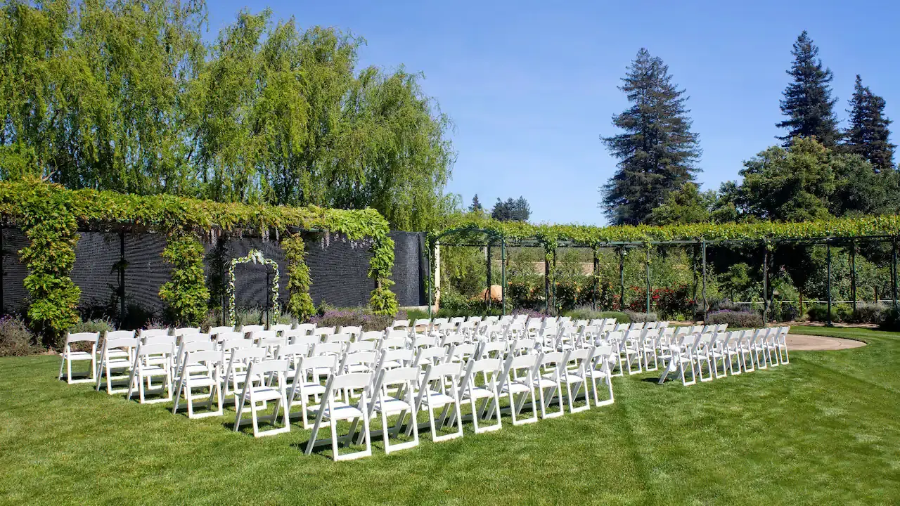 The Knights Valley Garden offers a romantic outdoor setting for ceremonies, featuring an 80-foot water wall, trellises adorned with wisteria, and fragrant lavender borders. This 4,950-square-foot garden can accommodate up to 350 seated guests or 500 standing, providing a picturesque and intimate atmosphere for your special day.