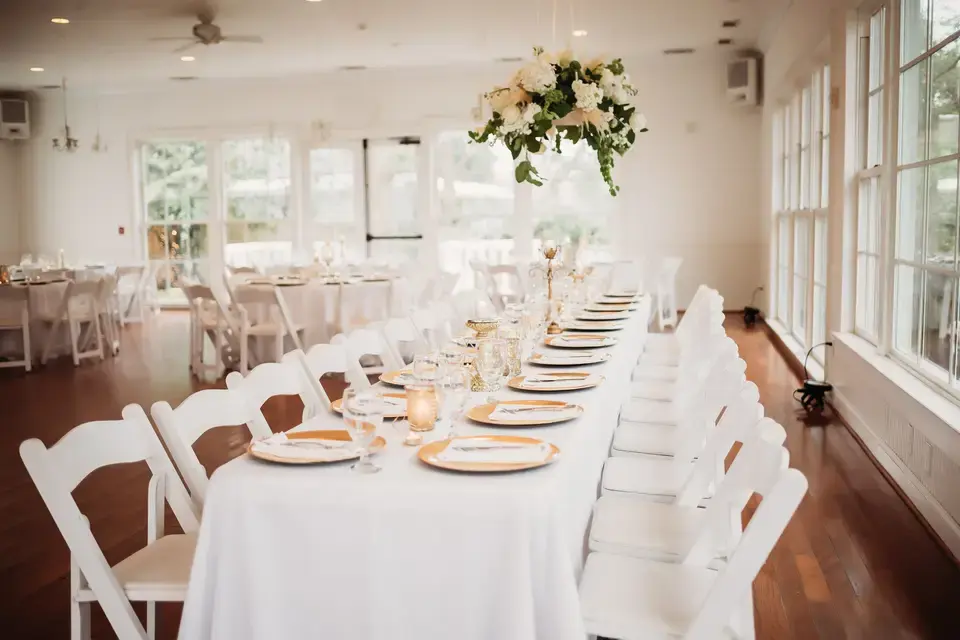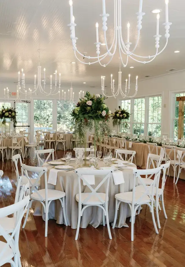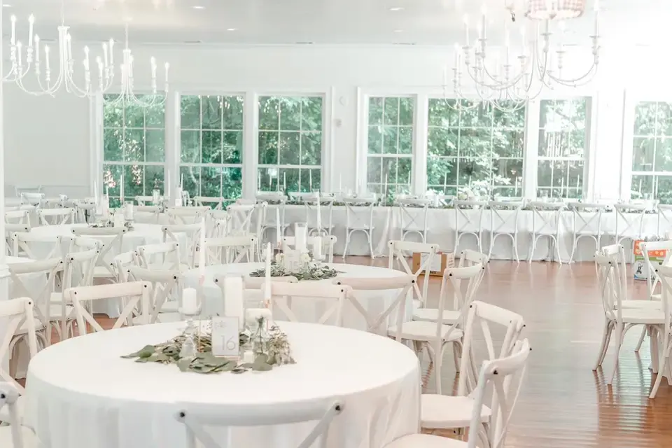 A 3,000 sq. ft. modern addition designed with floor-to-ceiling windows, soaring ceilings, and crystal chandeliers. It offers a "natural light" feel during the day and an elegant, polished atmosphere for evening dancing and dining.