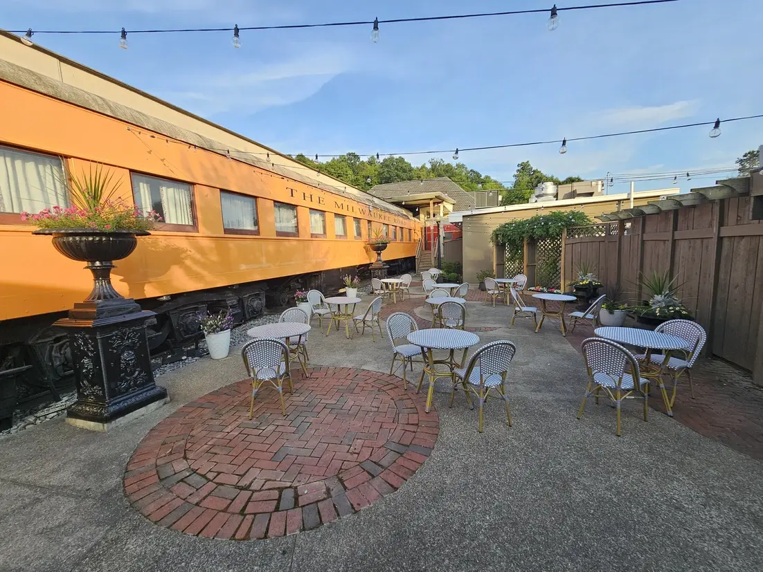 Enjoy an intimate al fresco experience in a charming courtyard that pays homage to railway history. Set against the backdrop of a vibrant orange vintage train car labeled "The Milwaukee Road," this space features classic brick-paved accents and bistro-style seating. Overhead, delicate string lighting creates a festive ambiance as the sun sets, making it an ideal spot for cocktail hours or casual gatherings. Surrounded by lush greenery and seasonal floral planters, the courtyard offers a unique, nostalgic atmosphere that invites guests to relax and mingle in a picturesque outdoor setting.