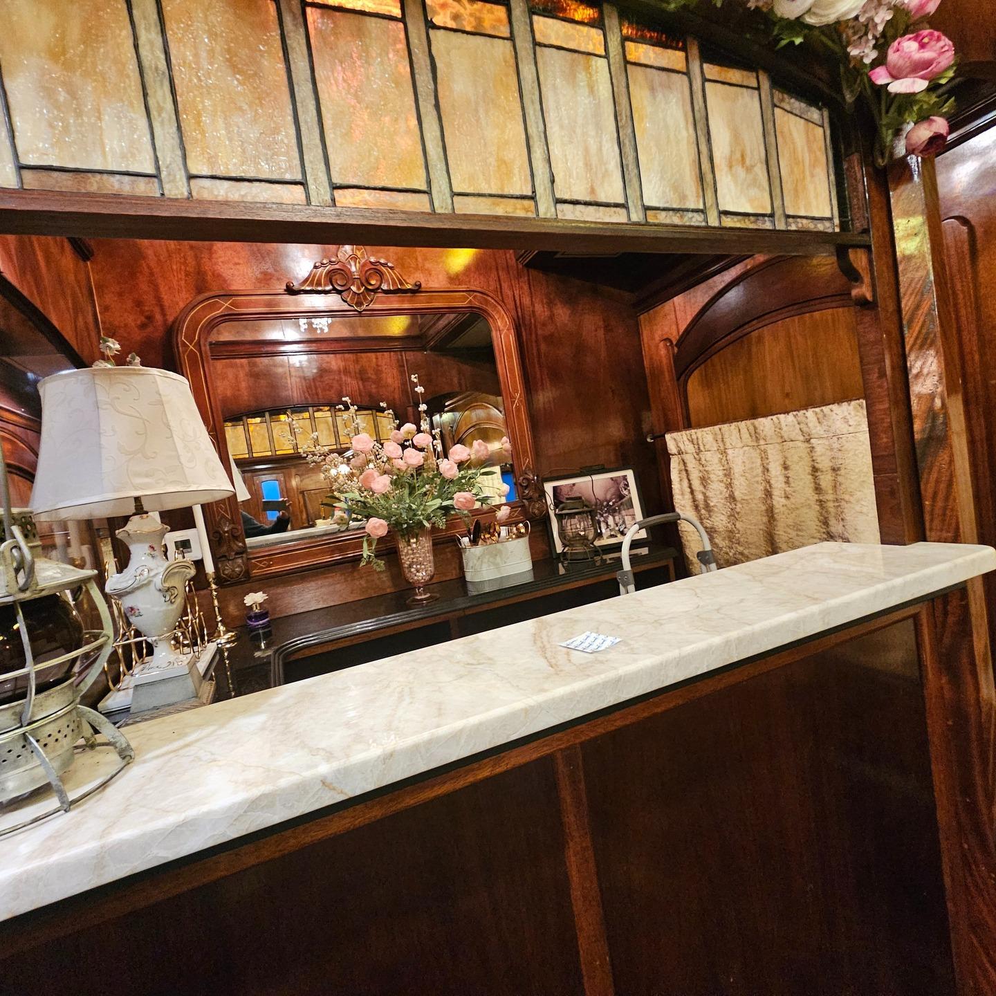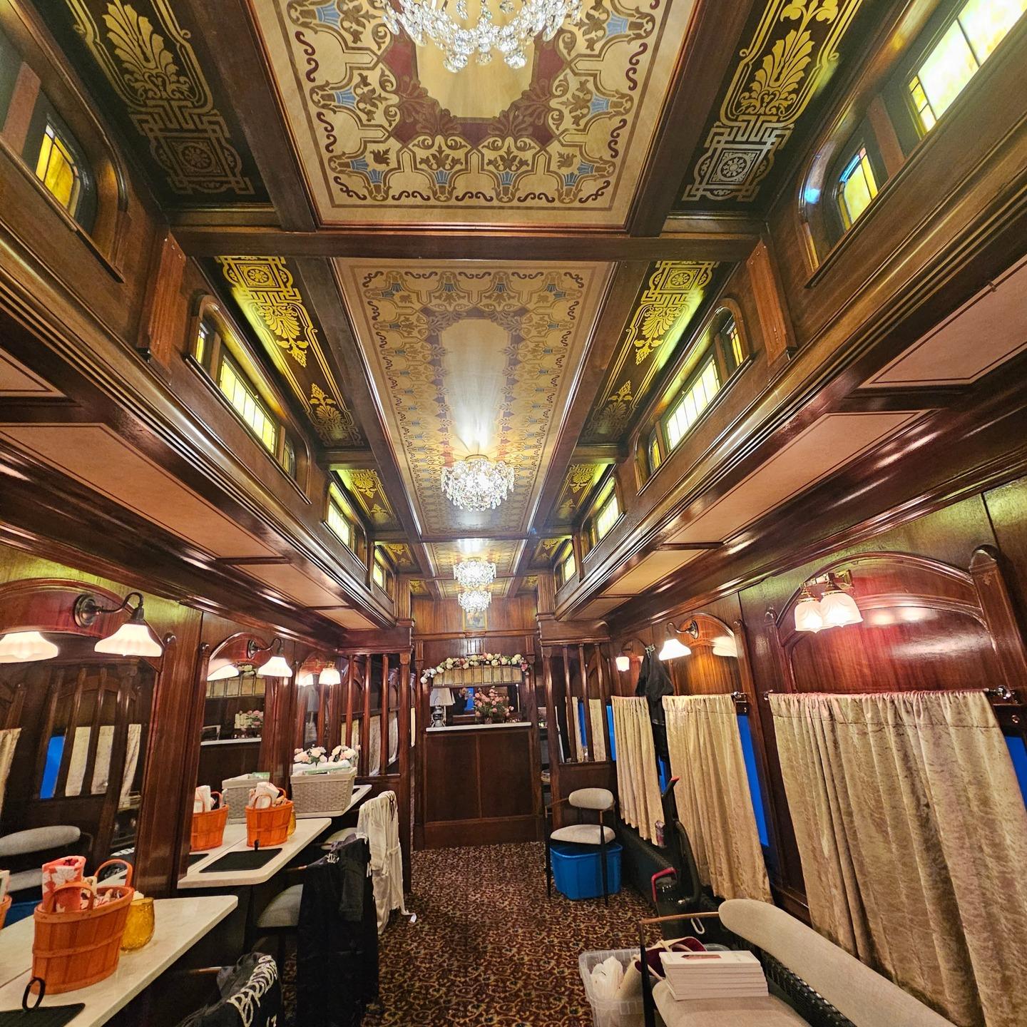 Prepare for your walk down the aisle in a setting of unparalleled vintage luxury. This exquisitely restored train car features rich, dark wood paneling and ornate, hand-painted ceiling murals that evoke the glamour of the Gilded Age. Crystal chandeliers and golden stained-glass accents illuminate the space, which is thoughtfully outfitted with plush seating, vanities, and ample mirrors for your wedding party. Every detail, from the velvet curtains to the intricate carpeting, ensures that your pre-ceremony moments are as photo-worthy and memorable as the main event itself.