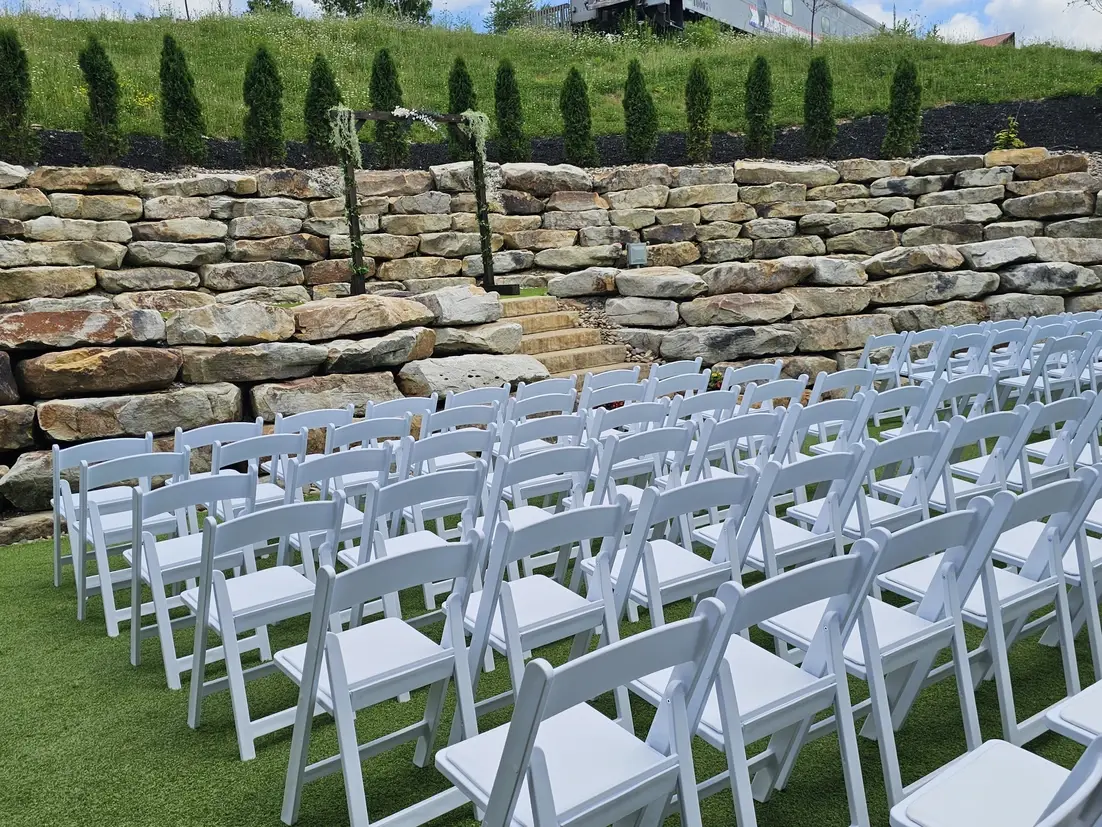 Exchange vows in a breathtaking outdoor theater designed with natural beauty in mind. This manicured ceremony site features tiered levels of vibrant green turf, bordered by rugged stone retaining walls and elegant evergreen trees. A minimalist wooden arbor serves as the perfect focal point, framing the couple against a backdrop of rolling hills and lush forest. With its crisp white seating and thoughtful landscaping, this space offers a serene and open-air environment for a romantic ceremony, allowing the natural landscape to take center stage as you say "I do".