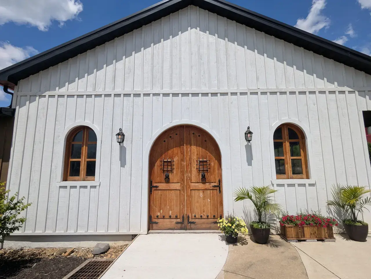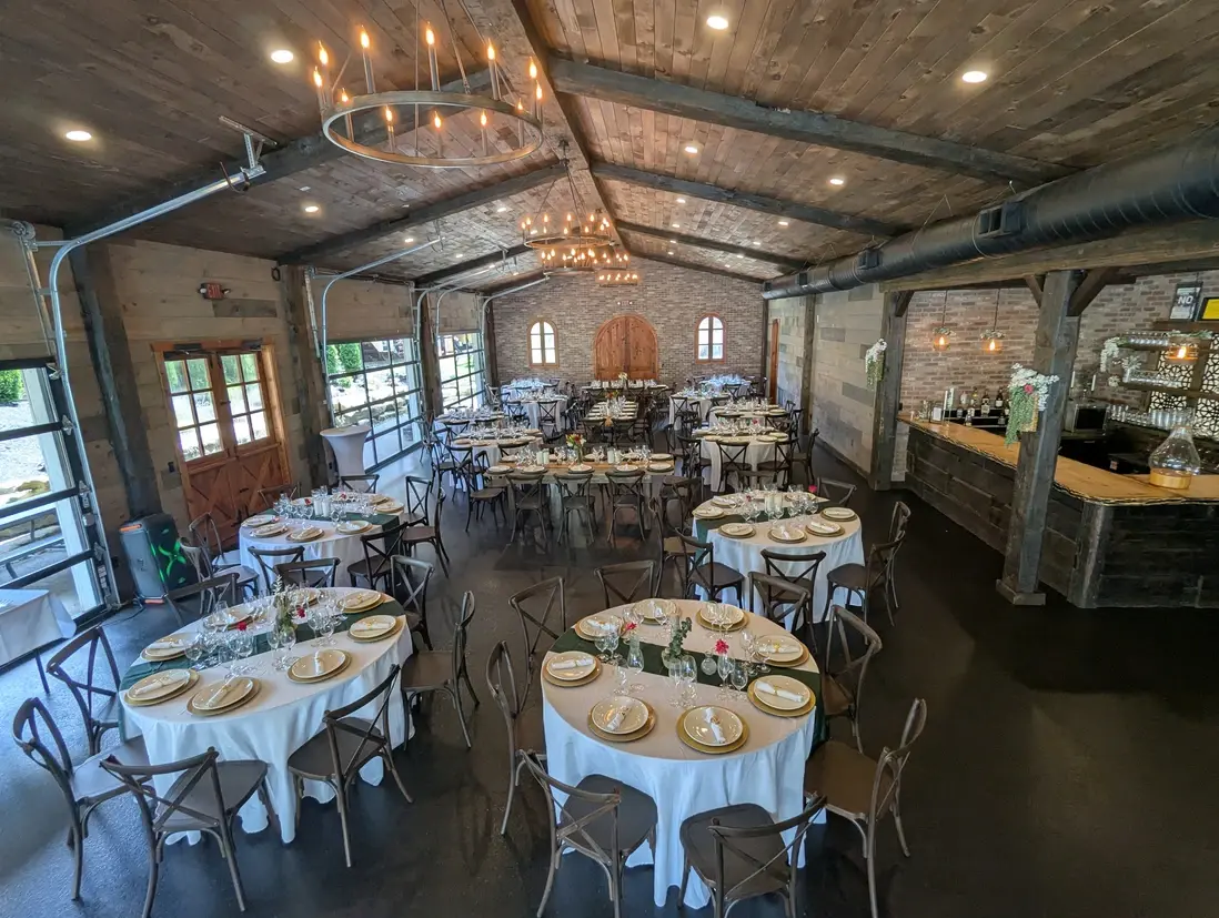 Step into a refined rustic retreat where soaring wood-plank ceilings and exposed brick walls create an atmosphere of timeless warmth. Wrought-iron chandeliers cast a romantic glow over the spacious interior, while large, industrial-style glass garage doors seamlessly connect the indoor celebration to the scenic outdoors. The space features beautiful dark flooring and arched wooden doorways that add a touch of old-world character, providing an elegant backdrop for dinner and dancing. Whether set with round tables in sage linens or long wooden farm tables, this versatile hall balances barn-style charm with polished sophistication.
