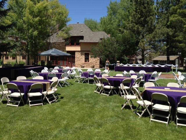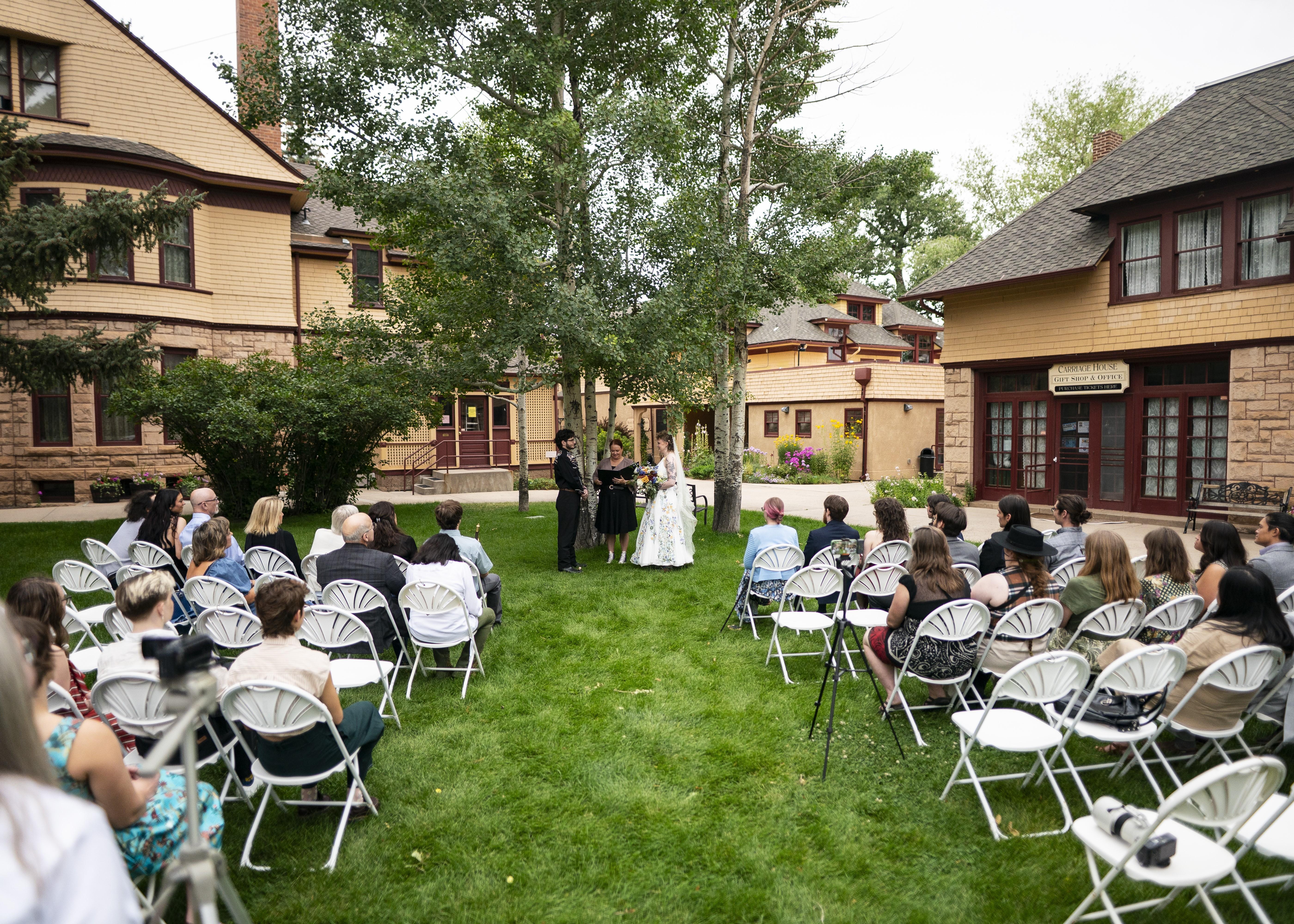 The outside lawn is approximately 15,000 sq. ft. and takes up over 1/4 of the entire block. It is well maintained and is surrounded by lush gardens and mature Colorado Blue Spruce, Crabapple Trees, Ponderosa Pines, Aspens and Cottonwoods. The gardens are well maintained by a volunteer group, the Laramie Garden Club. We have a metal arch for use and chairs that can seat up to 200 people. For access to the other buildings during your outside event, you must schedule ahead of time.