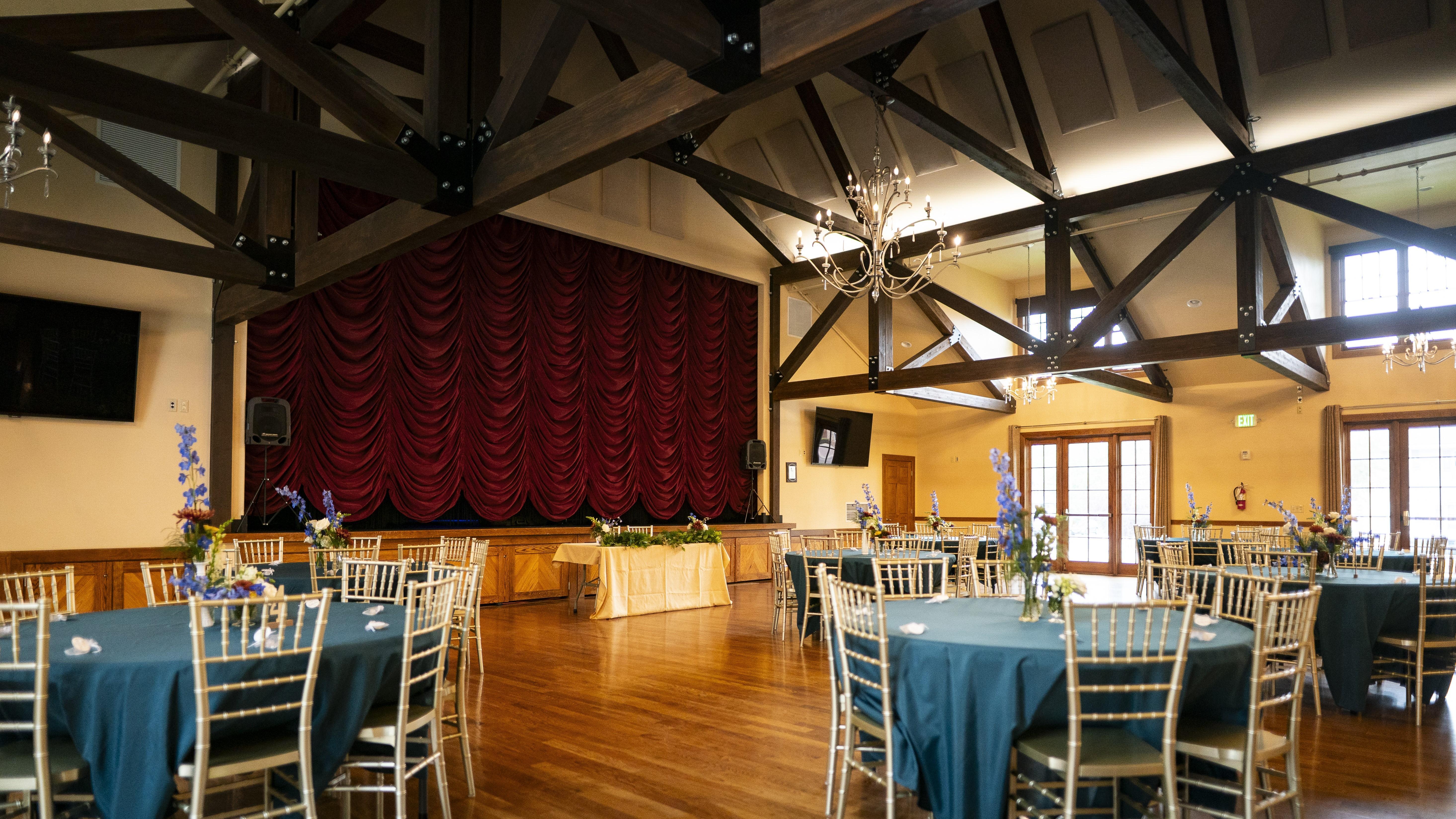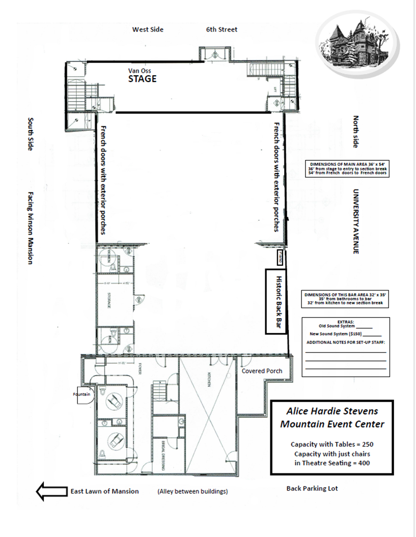 The main area measures 1,944 sq. ft. with beautiful oak floors, a full stage with red velvet curtain, French doors that lead outside. This space has a vaulted beamed ceiling with glamorous chandeliers. There is an attached room that measures 1,120 sq. ft. with oak floors and a 1910 historic bar for use.