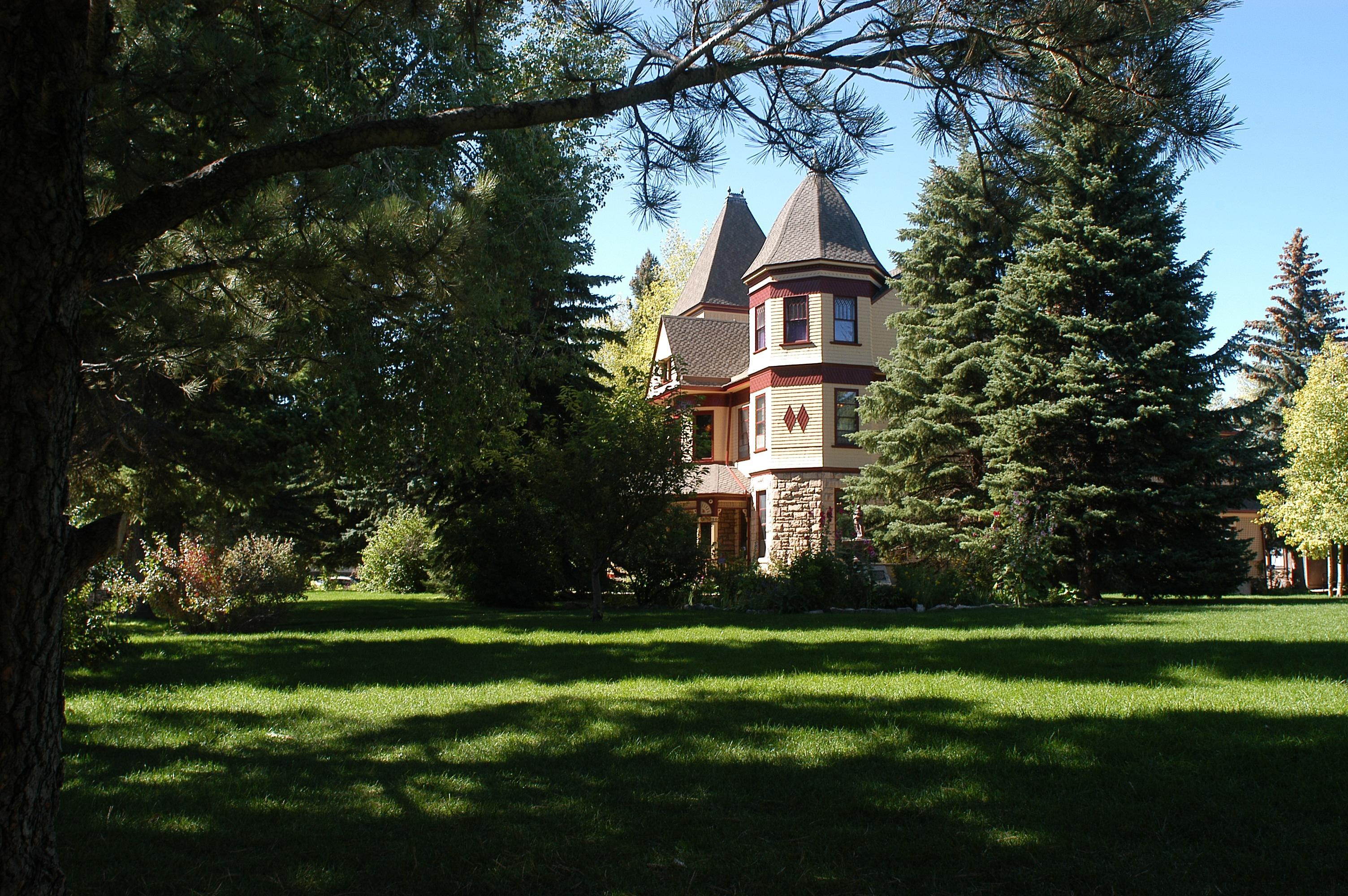The east lawn has lush green grass and is surrounded by maintained gardens and mature trees. The historic Ivinson Mansion makes a beautiful backdrop.