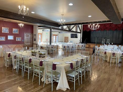 There are three tv's with a remote that is available for use. The space includes 4 public bathrooms and a bridal suite with an attached bathroom for use by the bride and her attendants. There is a fully equipped kitchen with two sinks, plenty of counter space, two stoves with oven, a microwave and a fridge and freezer. There are 12 x8' rectangle tables, 9 x6' rectangle tables, 25 x60" round tables, 8 x45" square tables, 4 high top and 4 short cocktail tables, and 200 Chivari chairs.