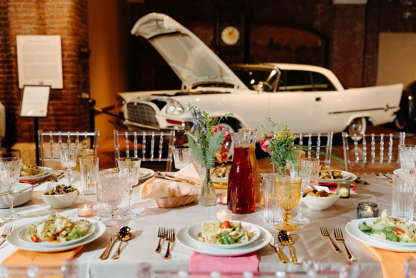 The Main Gallery offers an immersive experience where history and romance collide. Surrounded by a world-class collection of vintage motorcars, your celebration takes place beneath original cathedral ceilings and massive exposed beams. The warm glow of the brick walls and the polished chrome of the exhibits create a sophisticated, moody ambiance that requires little additional decor. It is a one-of-a-kind setting for a reception or indoor ceremony, offering guests the chance to wander through automotive history while celebrating your modern love story in a space that feels like a private European estate