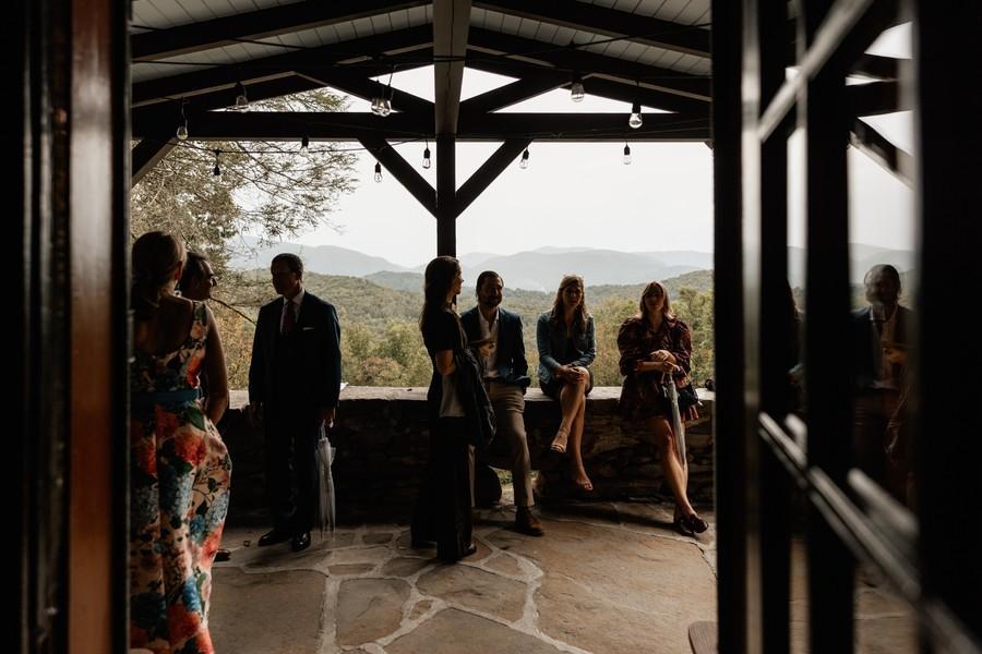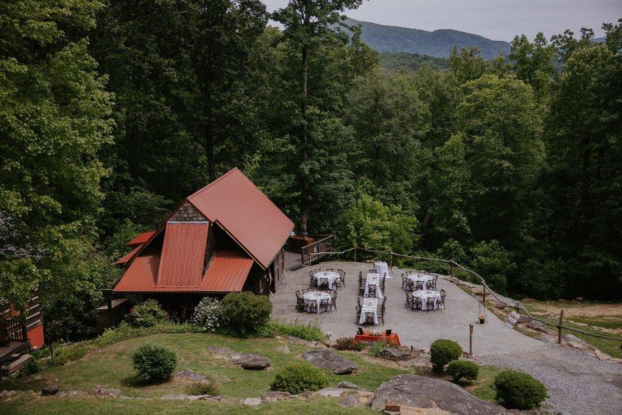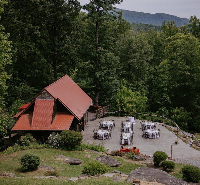 A partially covered stone porch with breathtaking mountain views. Enjoy sipping coffee and having conversations out here throughout your wedding weekend. A gorgeous and unique location for a rehearsal dinner for your guests. Some couples have also used this space for cocktail hour, a first look or couples portraits during golden hour where you can look down over your guests enjoying the reception at the Rustic Barn.