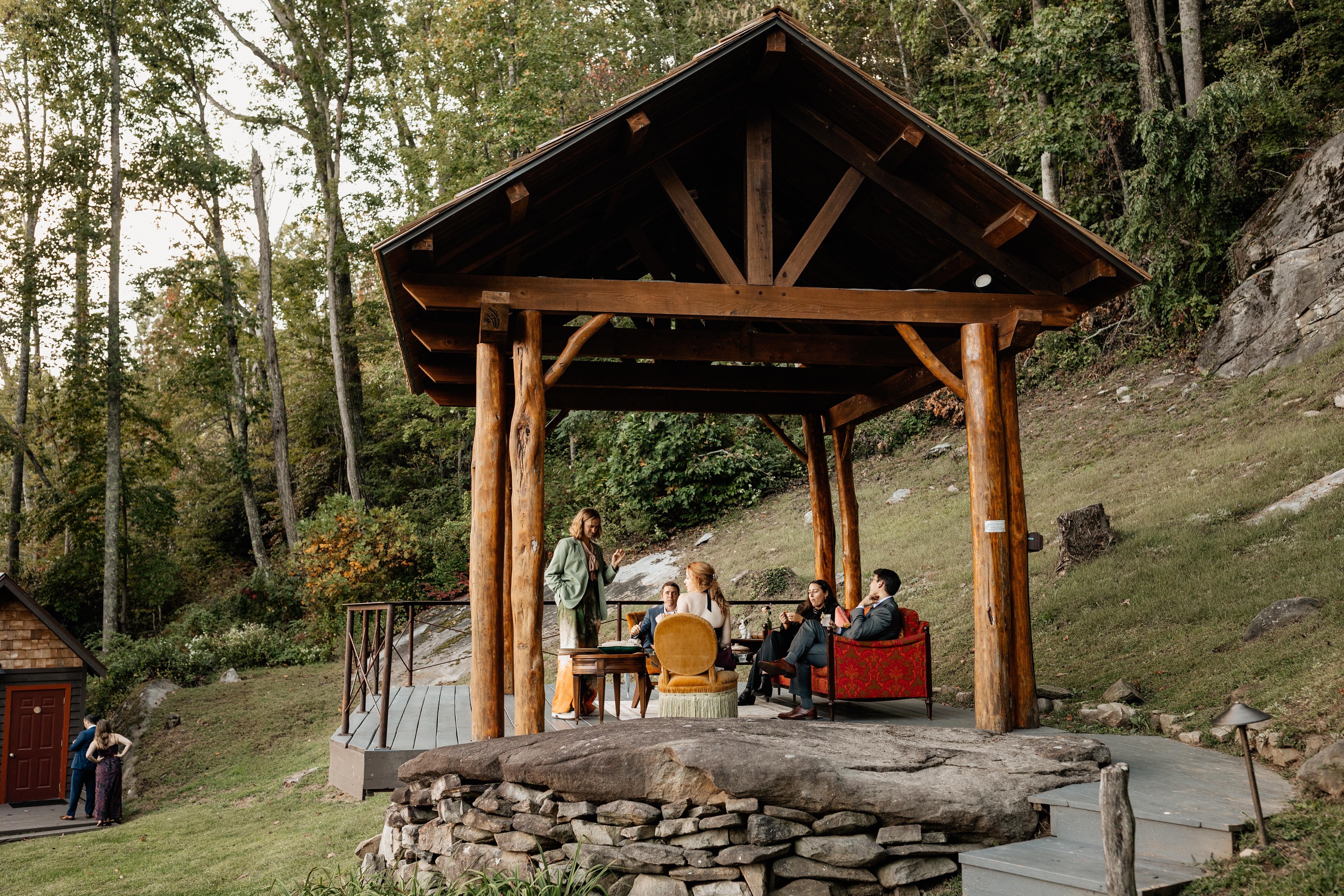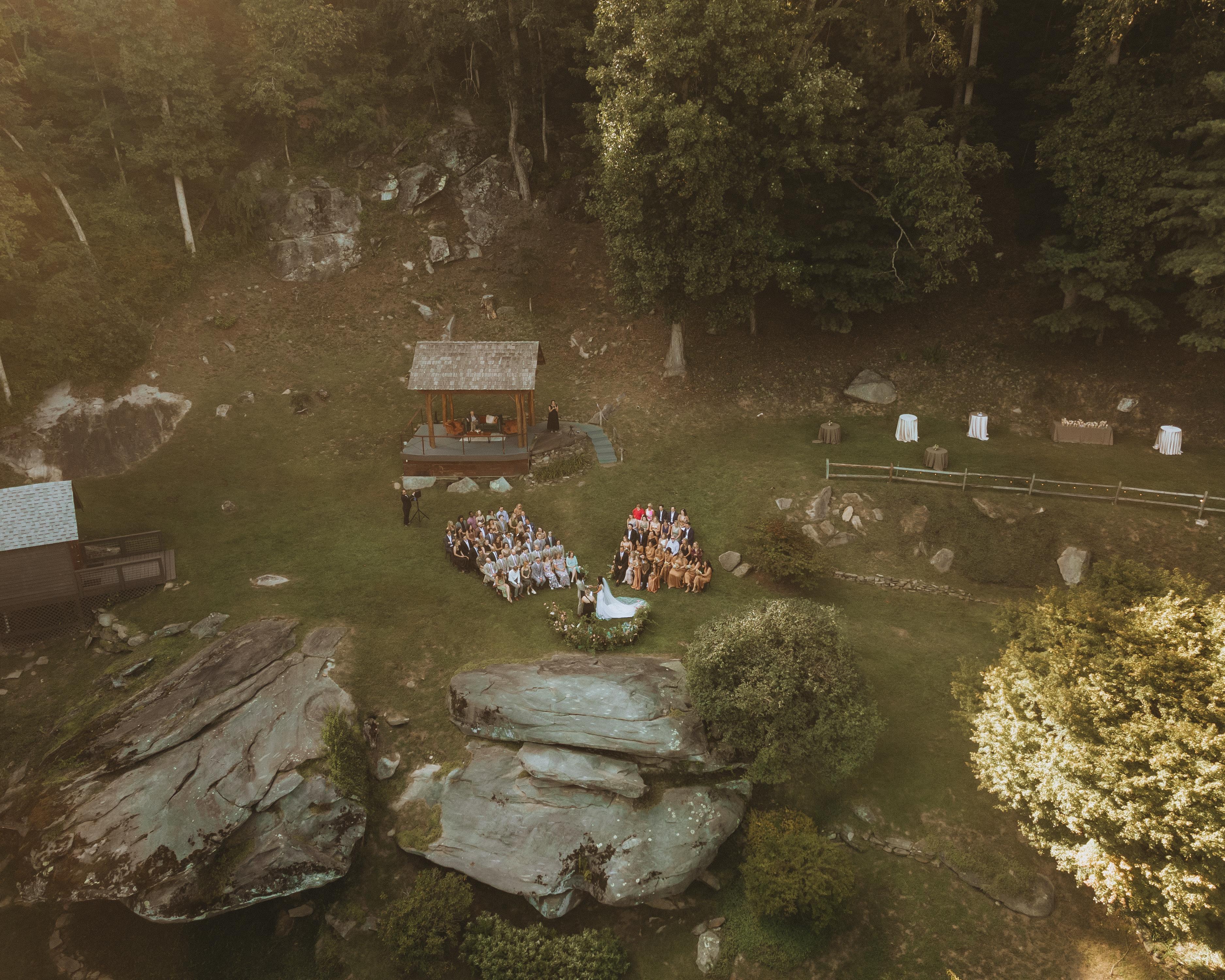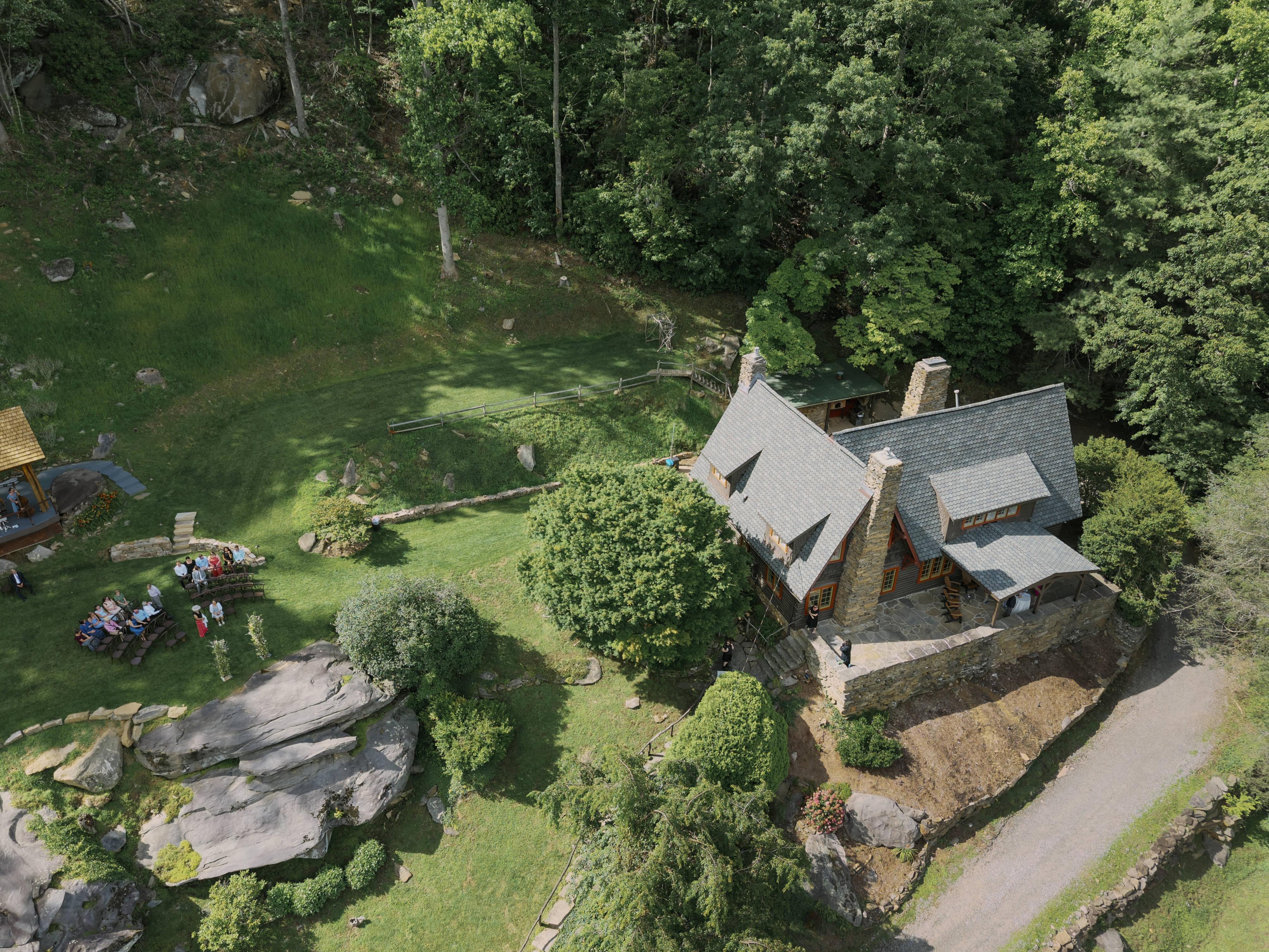 A flat grassy lawn on top of a large boulder surrounded by forest trees. A lovely ceremony site with views of the Blue Ridge Mountains. A covered event pavilion overlooks the lawn and mountain view as well. This space may be used for your ceremony musicians, cocktail hour grazing and high-top tables. It's also an option for a covered ceremony location for an intimate wedding or a space to enjoy dinner with mountain views during your wedding weekend on property.