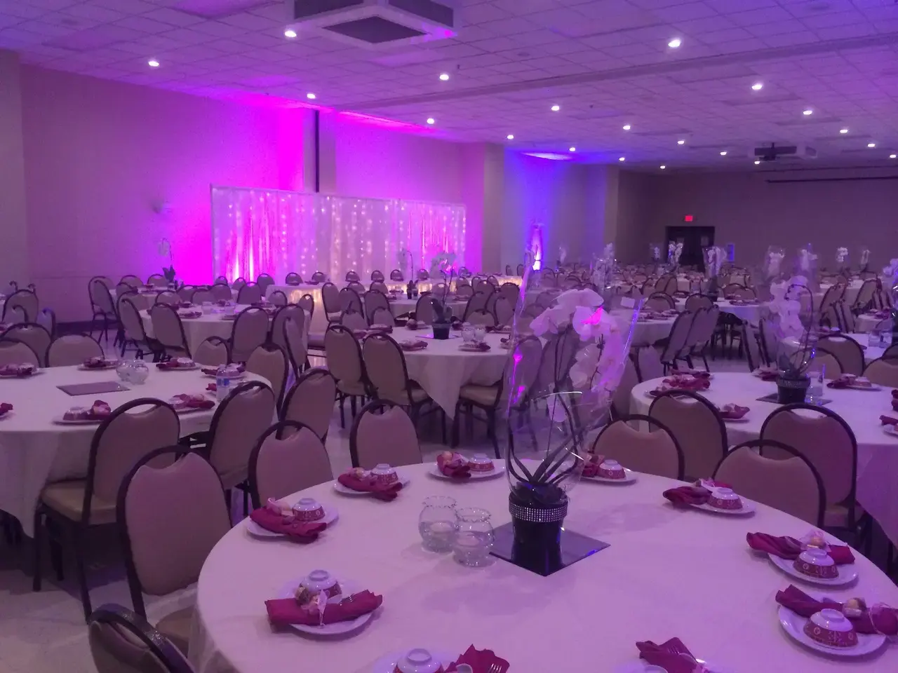 The Main Ballroom is the venue’s flagship space, featuring a spacious and flexible layout that adapts to any wedding style. The room is beautifully appointed with permanent decorative hanging lights that cast a romantic glow over the entire celebration. A built-in professional stage serves as the perfect focal point for your head table or live entertainment, while the expansive floor provides plenty of room for dining and dancing. With neutral tones and modern finishes, this climate-controlled hall offers a sophisticated indoor sanctuary that keeps your guests comfortable while the party stays vibrant all night long.