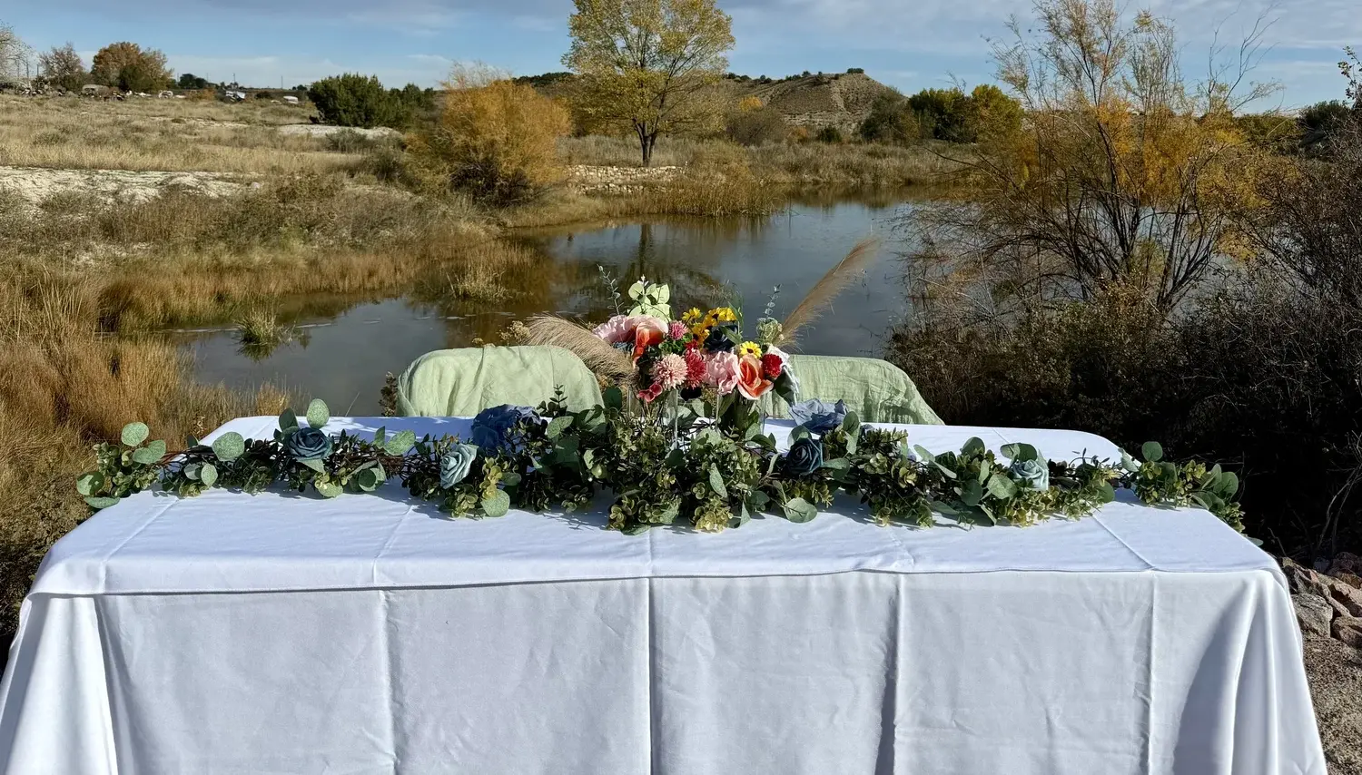 We are a rustic outdoor wedding venue with a stream and a pond and Pikes Peak in the view. We provide tables, chairs, tablecloths, and day of coordination. We handle set up and tear down, so you can enjoy your wedding.