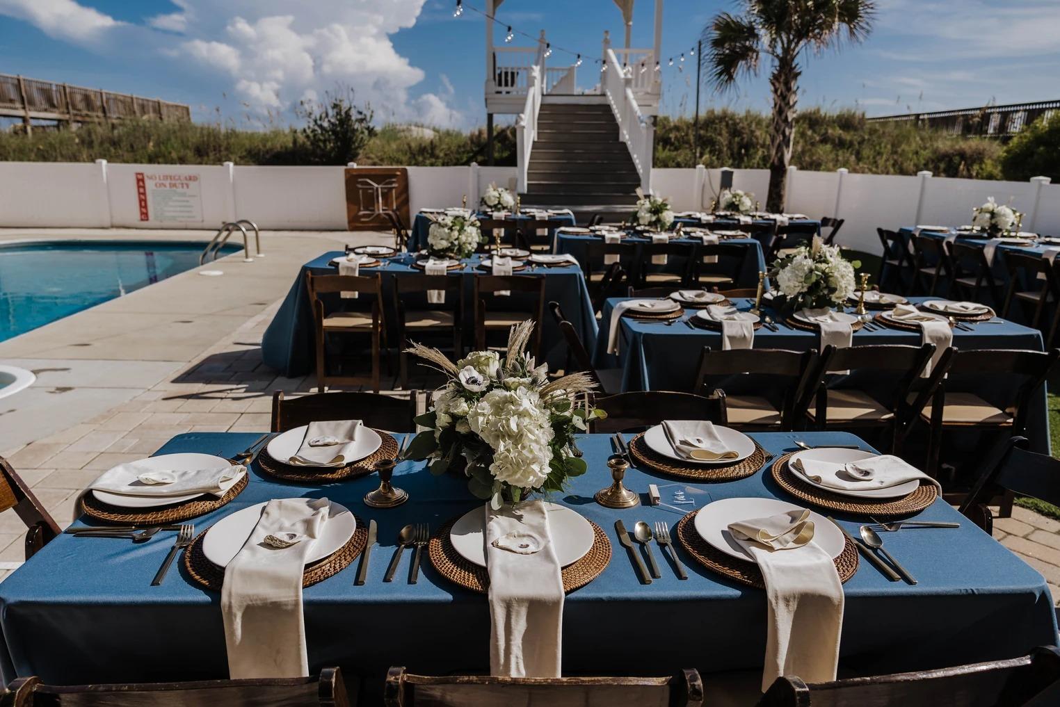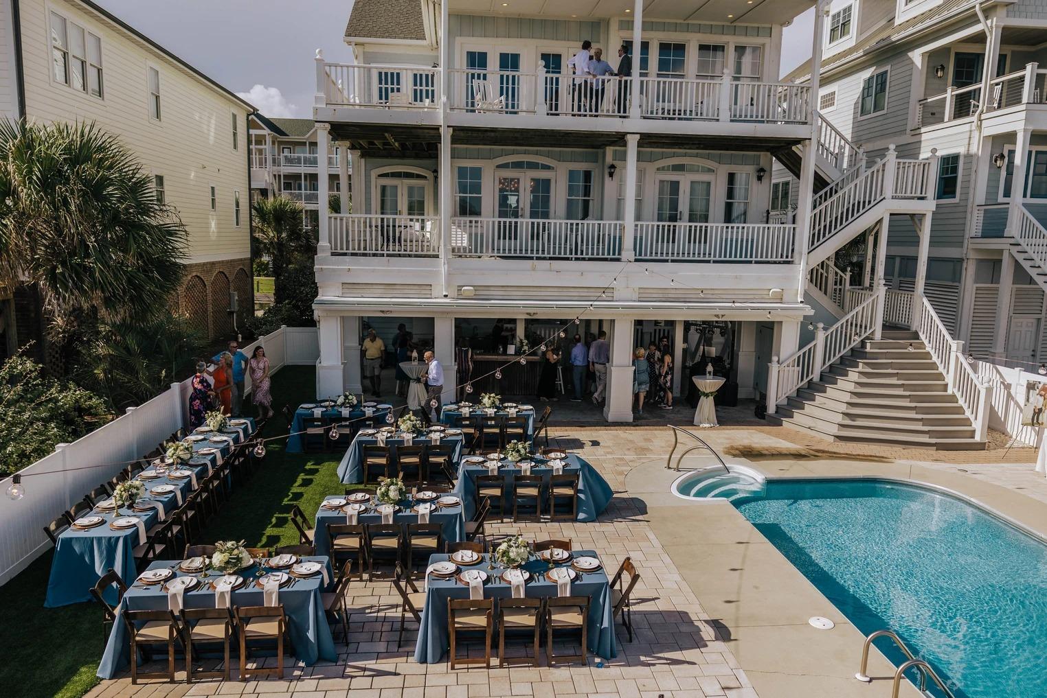 Located just steps away via a private walkway, the beach strand offers a pristine, natural setting for an oceanfront ceremony. Couples can exchange vows against the backdrop of the turquoise Atlantic and rolling dunes, enjoying total privacy away from public access points. This "blank canvas" space allows for custom floral arches and seating arrangements that highlight the raw beauty of the North Carolina coast. It is the quintessential choice for couples dreaming of a romantic, salt-air ceremony followed by an easy stroll back to the estate.