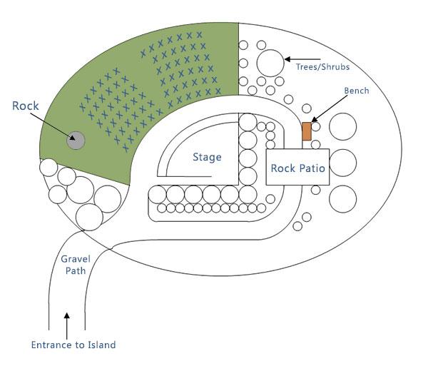 The design of Willow Pond Island is dominated by a winding pathway where existing plantings are enhanced by seasonal color.