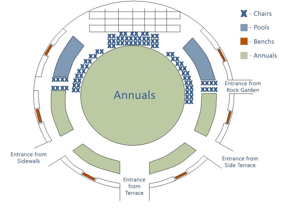 Sunflowers, zinnias, marigolds, milkweed, poppies, purple coneflower, salvia, and many others blaze with color as they attract butterflies and hummingbirds to the blossoms. The central bed is planted with shrubs and accent boulders, with an array of flowering annuals encircling. The pavilion is the focal point of the garden and is flanked by two beehive-shaped stone fountain pools. It makes a perfect gathering area for your ceremony to take place. This large space will take up to 150 guests including the wedding party. The round design and radiating pathways will ensure all your guests have a great view of the ceremony from wherever they sit. Over 6,000 annuals are used to plant this garden, which is available for ceremonies that are scheduled beginning the last weekend in June through the end of September. The Gateway Garden is at its peak mid-July through early September. There is electricity at the bases of the two back pavilion pillars.