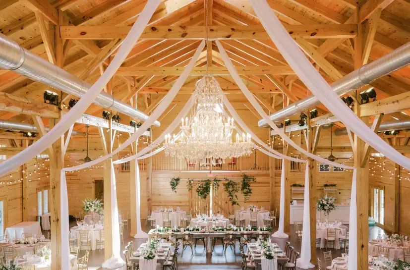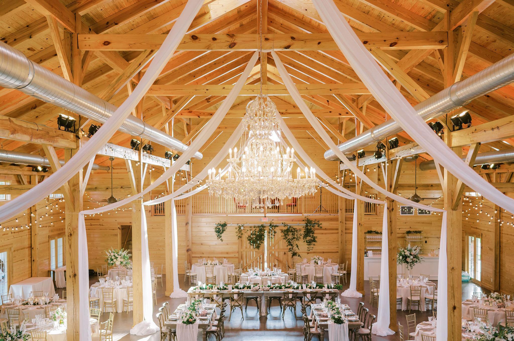 A high-end luxury ballroom with crystal chandeliers, pine timber beams, and large windows.