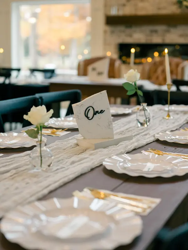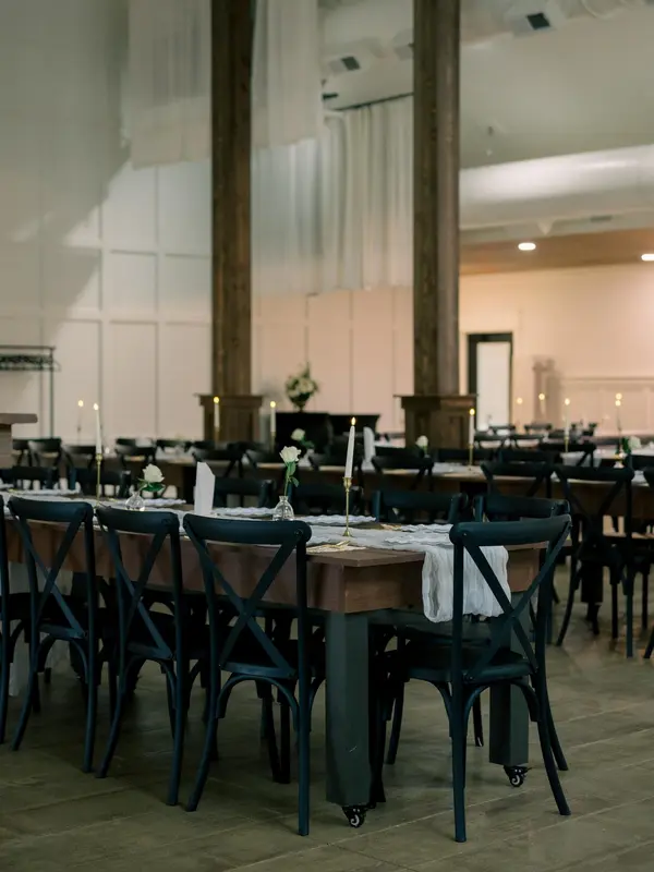 Our indoor space is suitable for an indoor ceremony and reception! Fully climatized and features an electric fireplace, handmade wooden tables & chairs for 150 guests. A stunning space on its own or the perfect backdrop to customize your big day.