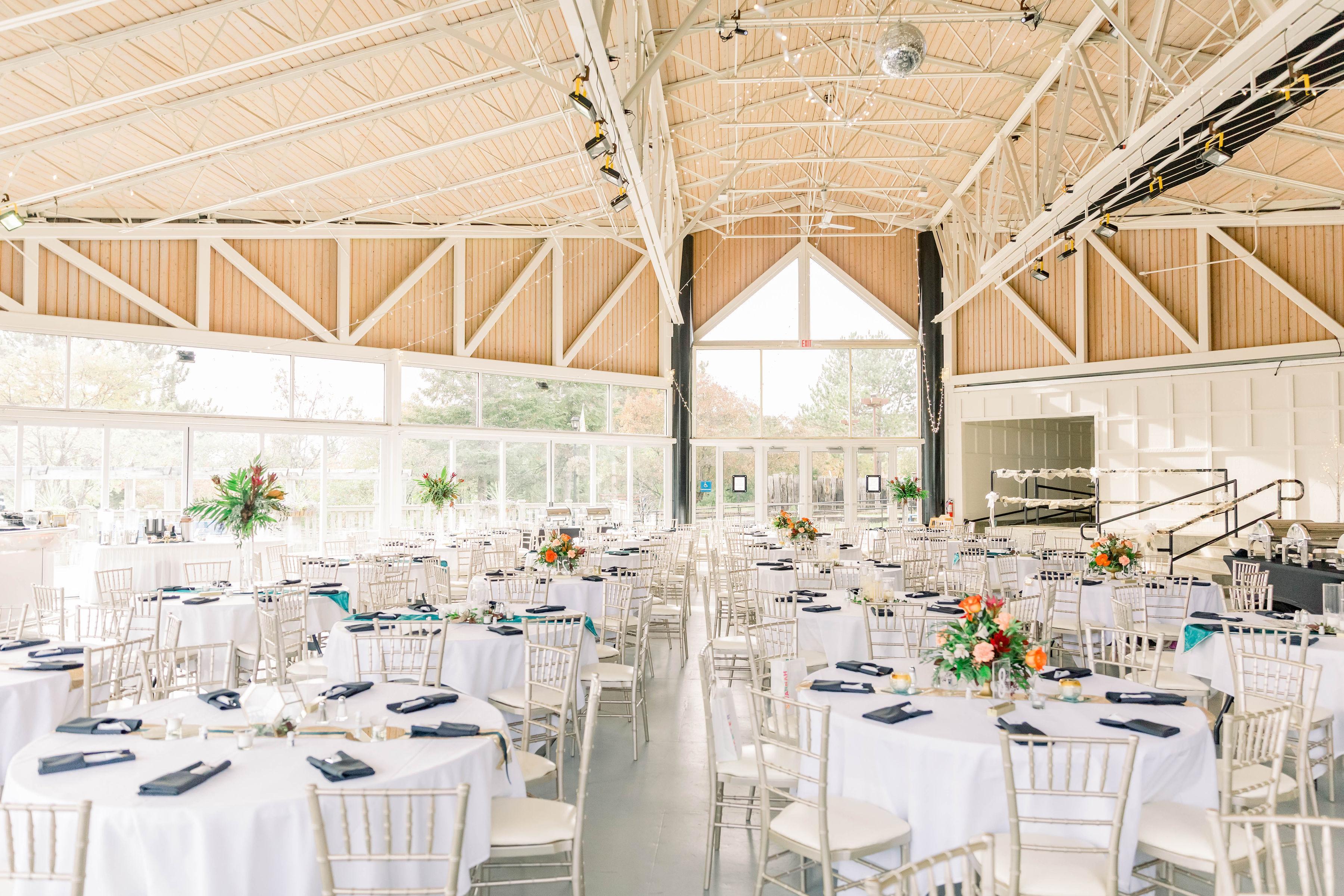 Bathed in natural light, this stunning pavilion offers a seamless blend of rustic charm and modern elegance. The soaring vaulted ceilings, accented by intricate white timber trusses and warm wood paneling, create an airy and expansive atmosphere for any celebration. Floor-to-ceiling windows wrap around the space, providing picturesque views of the surrounding greenery and inviting the beauty of the outdoors inside. With its clean lines, polished flooring, and delicate bistro lighting, this versatile space serves as a bright and sophisticated canvas, perfect for bringing your unique wedding vision to life.