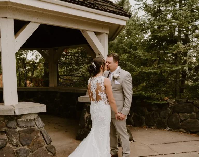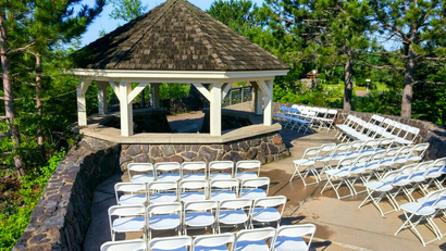 An outdoor ceremony site, the Gazebo is a beautiful option for your ceremony. Experience an intimate exchange of vows within this charming stone-and-timber gazebo. Perched at the edge of a lush, wooded landscape, this space features a classic shingled roof supported by elegant cream-colored pillars and a rustic fieldstone foundation. The surrounding stone patio provides a clean, structured area for guest seating, while the elevated position offers panoramic views of the forest canopy. It is a perfect blend of architectural character and natural beauty, offering a cozy yet open atmosphere for a truly memorable ceremony.