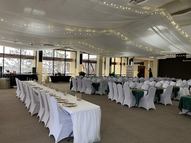 - Round tables for up to 240 people (30 tables with 8 chairs). - Rectangular tables for up to 296 people (37 tables with 8 chairs). - Cocktail tables and extra tables are available by request. - No air conditioning or heat Restrooms are located in the dressing rooms and in the mini golf area