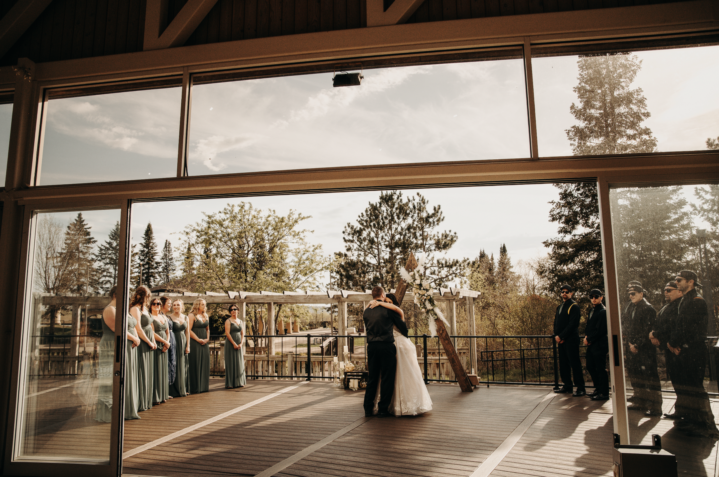 Taconite Square is a breathtaking reception hall that perfectly marries grand scale with warm, inviting details. The space is defined by its soaring cathedral ceilings and an impressive network of white timber trusses that create a sense of openness and light. Surrounded by expansive windows, the room is flooded with natural sunshine, offering guests a constant connection to the lush greenery outside. The polished floors and clean white walls provide a sophisticated, modern canvas, while delicate bistro lighting adds a touch of whimsical charm to the air.