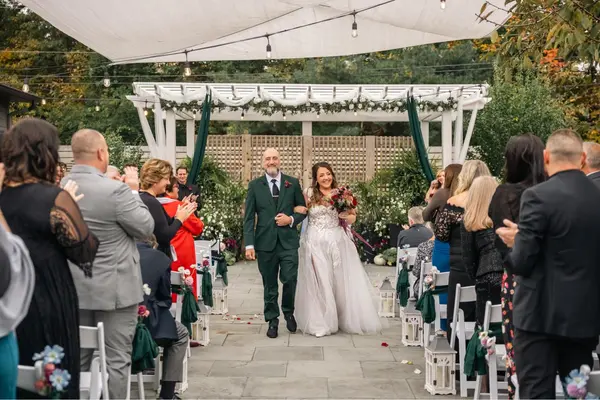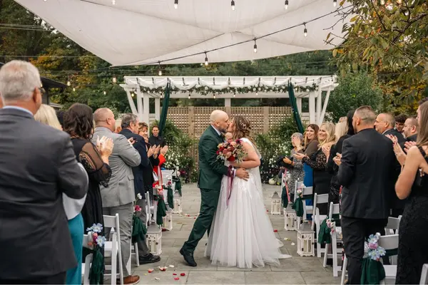 Our venue offers an exceptional wedding experience. The expansive bridal suite accommodates 25+ with vanities, mirrors, and a mimosa bar. Ceremonies for up to 170 on our blue stone patio include welcome drinks, cushioned chairs, a customizable pergola, and sound system. Cocktail hour features appetizers across foyer/patios, beer buckets, and a photo-ready waterfall. Receptions boast lighting, sound, a sweetheart table, dance floor, and ballroom bar. After parties extend to our patios with sound, lights, and space for games, allowing guests to leisurely return to their hotel.