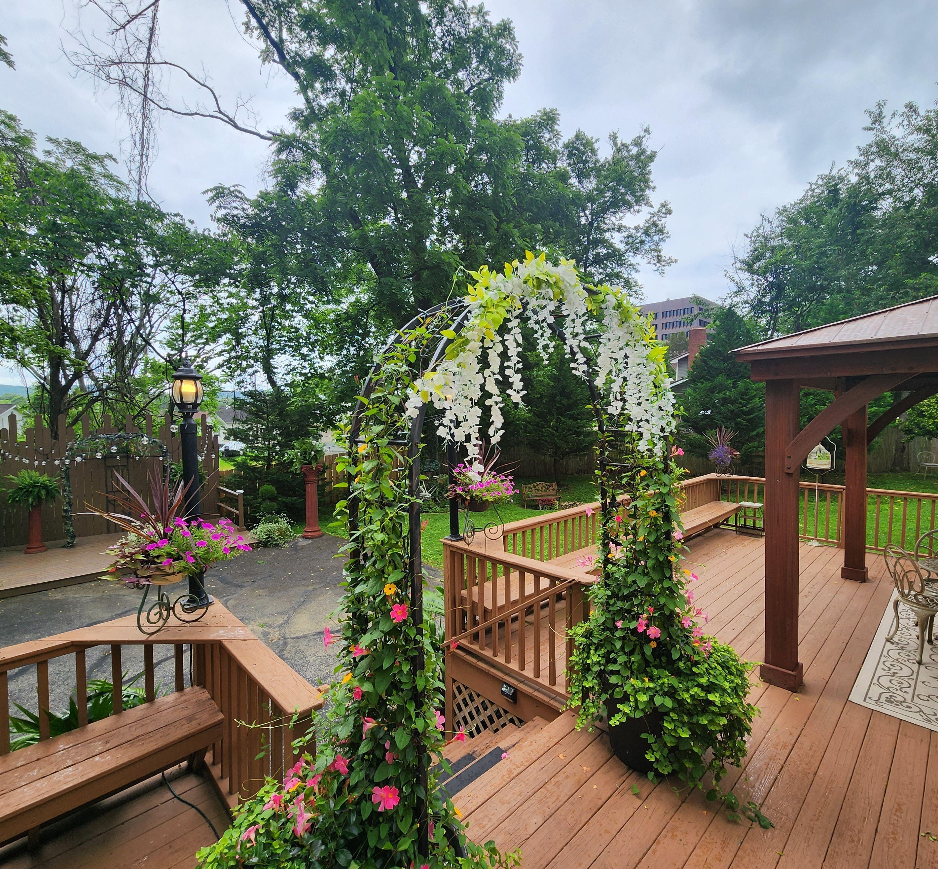 Step onto our elevated wooden deck, a charming outdoor space that seamlessly blends rustic warmth with natural beauty. This inviting area features a grand floral-draped archway blooming with delicate white wisteria and vibrant pink petals, creating a picturesque entrance or ceremony focal point.