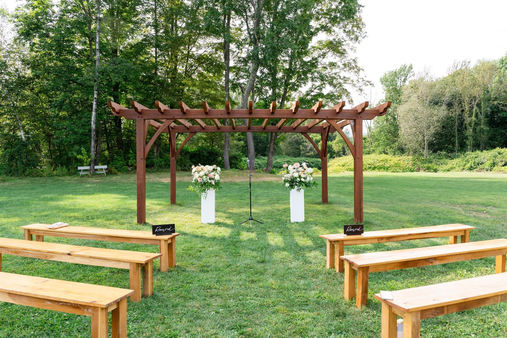 Offers a breathtaking ceremony location set on a lush, one-acre meadow surrounded by Vermont's natural beauty. Perfect for romantic outdoor ceremonies, or a picturesque reception space under a tent, this serene space allows for open-air celebrations with ample room for guests to enjoy the picturesque surroundings.