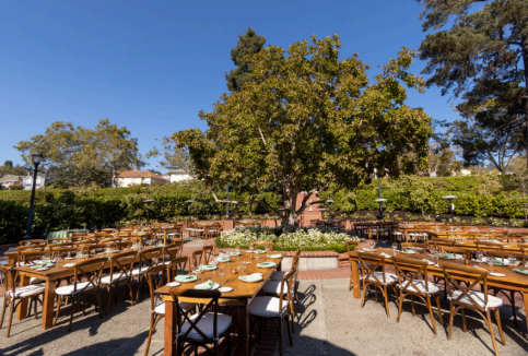 The venue features a collection of diverse spaces tailored for seamless transitions. Exchange vows in the Redwood Amphitheater, where soaring trees and a babbling brook create a cathedral-like atmosphere. For a grander focal point, the Exedra Plaza Fountain serves as a stately centerpiece for outdoor ceremonies. Receptions flow naturally into the Community Hall, a sophisticated space defined by high-beamed ceilings, hardwood floors, and floor-to-ceiling windows that invite the outdoors in. Step onto the adjacent terracotta tile patio for al fresco dining under the stars, or utilize the tranquil Japanese Tea House as a serene VIP suite or intimate ceremony spot.