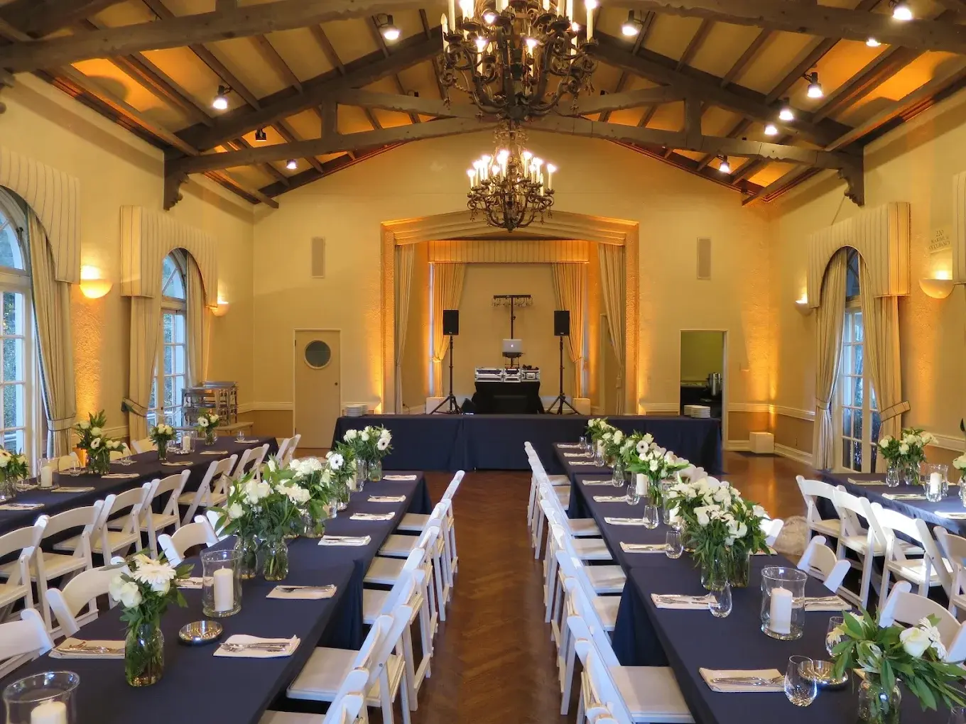 Piedmont Community Hall offers a splendid structure, Mediterranean in style with light taupe walls and terracotta tile roof. The main event space is a great party room, with a high, beamed ceiling, newly renovated shining hardwood floors and chandeliers. Floor-to-ceiling windows allows lots of natural light and ensure that the “outdoor” feeling of the adjacent park carries over to your reception. This is a refined, nicely designed space, suitable for an elegant wedding, company party or corporate retreat. *120 inside seated *200 seated outdoors