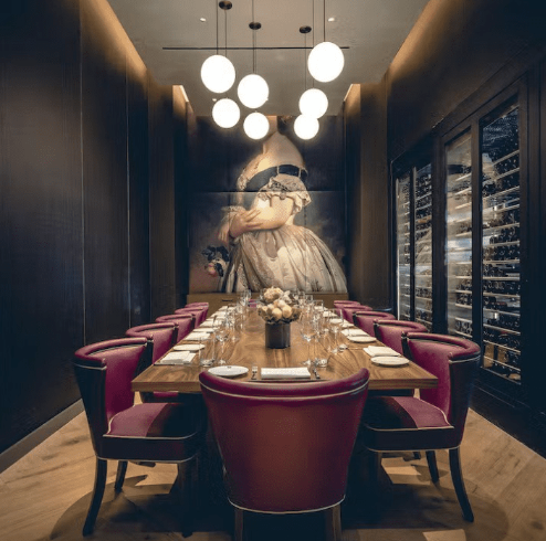 This private dining room offers a striking yet romantic backdrop for rehearsal dinners, elopements, and micro-wedding celebrations. Framed by glass doors, and a curated wall of fine wines, the space centers around a wooden communal table beneath warm globe lighting that casts a soft, flattering glow for an unforgettable evening. There is an artful atmosphere that feels both exclusive and inviting — perfect for heartfelt toasts, shared courses, and meaningful moments with your closest guests.