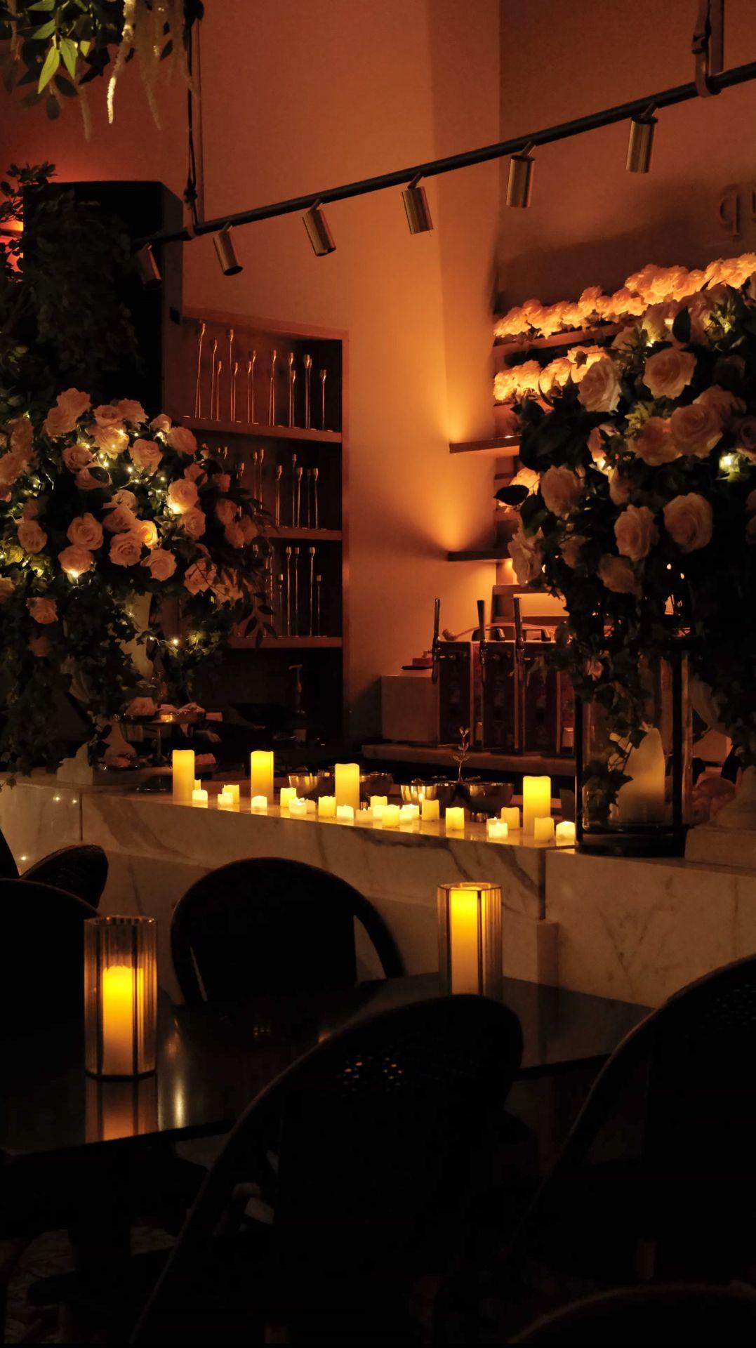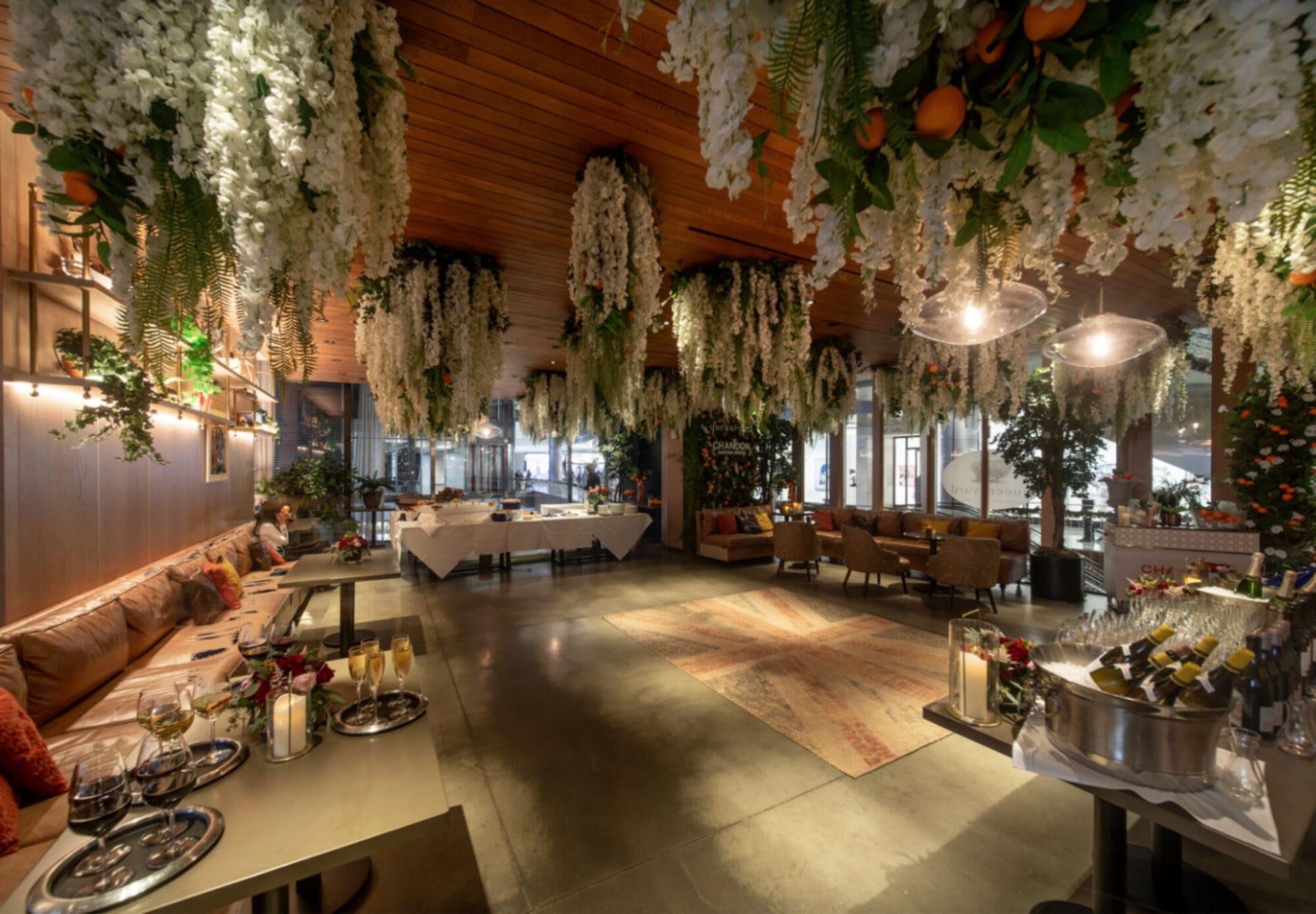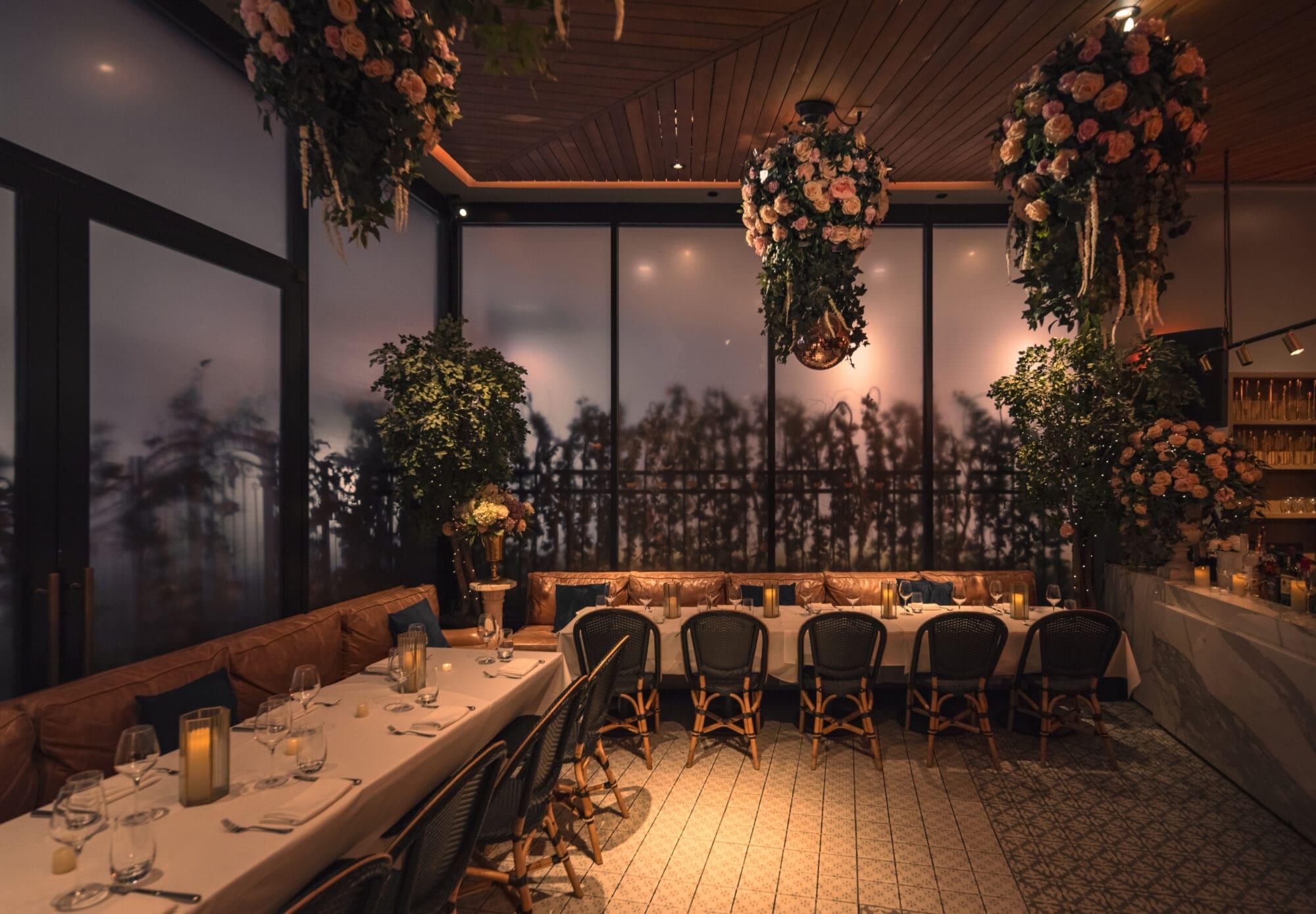 This bright and airy space features hanging floral arrangements that bring the outdoors inside. It serves as a versatile setting for mid-sized wedding showers, rehearsal dinners, or ceremonies. The layout emphasizes open views and a botanical aesthetic that pairs perfectly with the restaurant’s modern British fare.