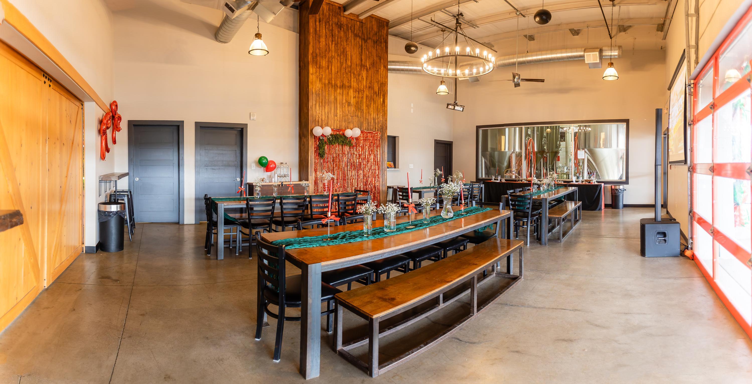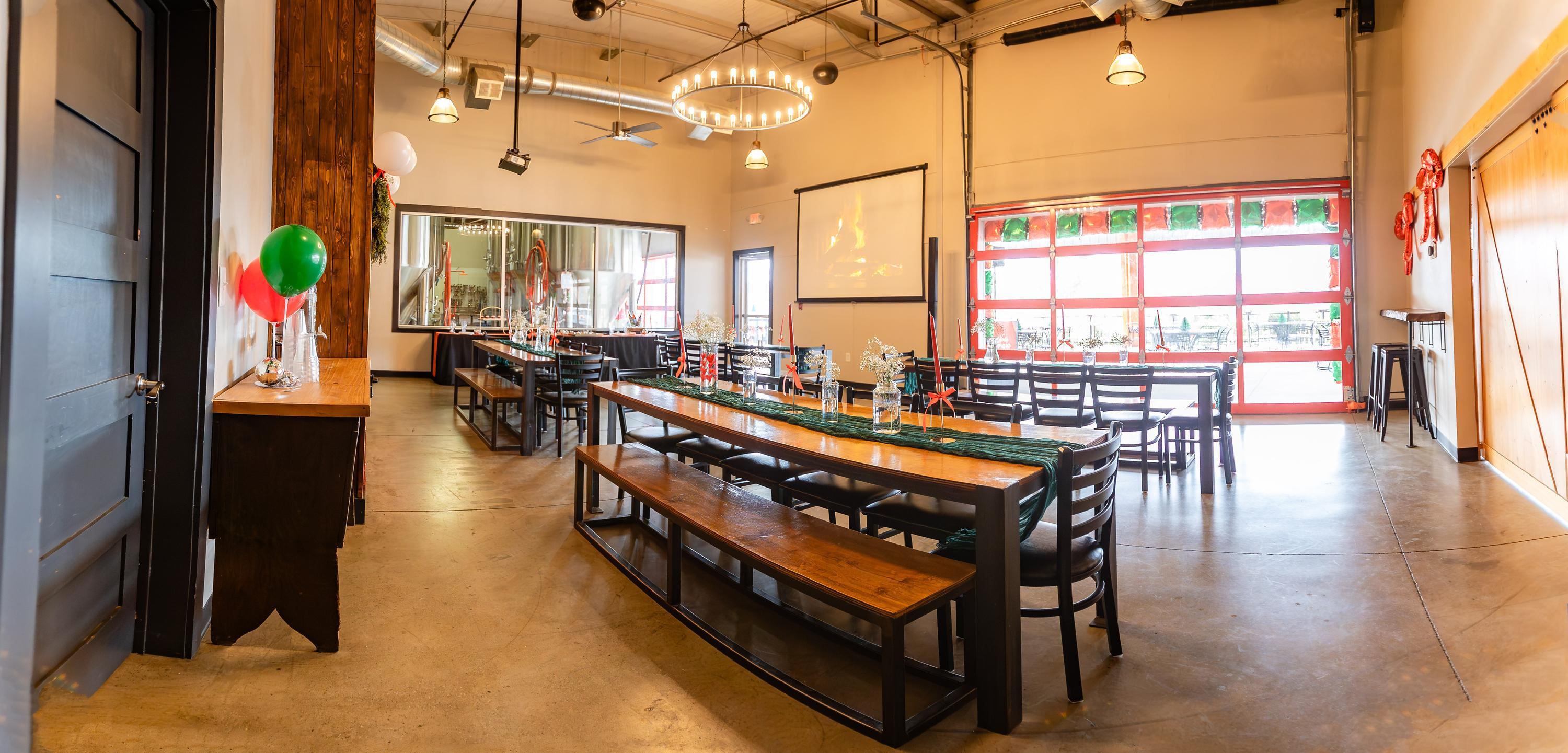 The Keeping Room is an intimate private event space within Reformation Brewery’s Canton taproom, ideal for gatherings of up to 40 guests. Its functional amenities are tailored for celebration and connection with private brewhouse views to roll-up garage doors and sliding barn doors that offer flexible privacy and a seamless flow between indoor and outdoor. The layout and easy patio access allow guests to mingle freely and enjoy convivial conversation and scenic surroundings.