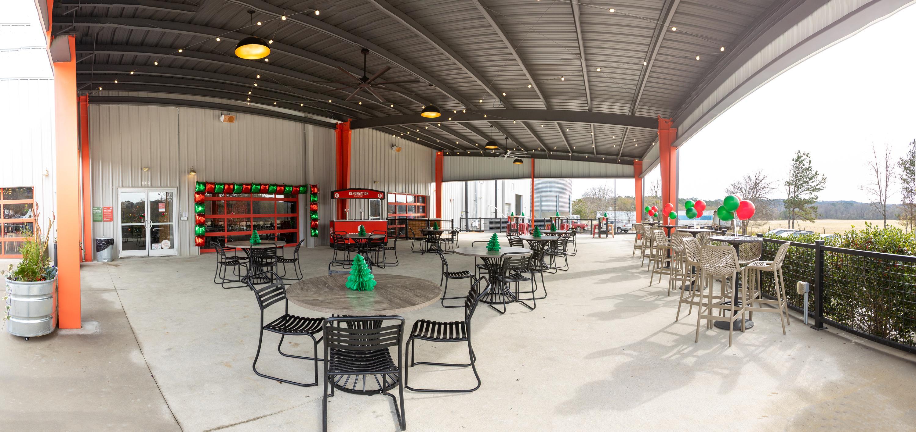 The Keeping Room & patio at Reformation Brewery in Canton offer a seamlessly integrated indoor-outdoor event setting that balances charm with flexible functionality. At its heart, the Keeping Room is a private, dedicated gathering space that sets a warm, inviting tone for celebrations. Large roll-up garage and barn doors invite abundant natural light and create effortless flow directly to the covered patio, expanding capacity and offering a casual, open-air extension.