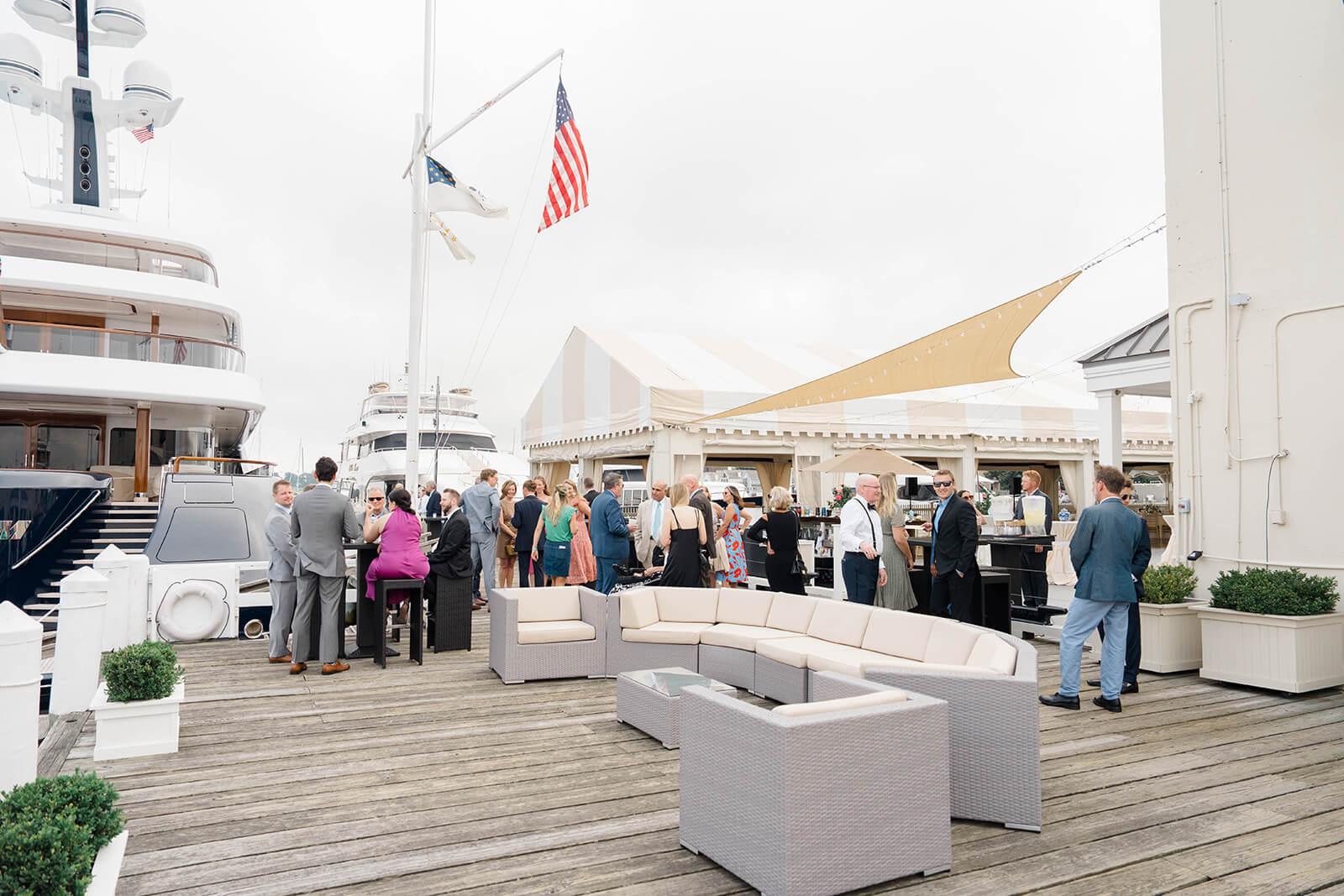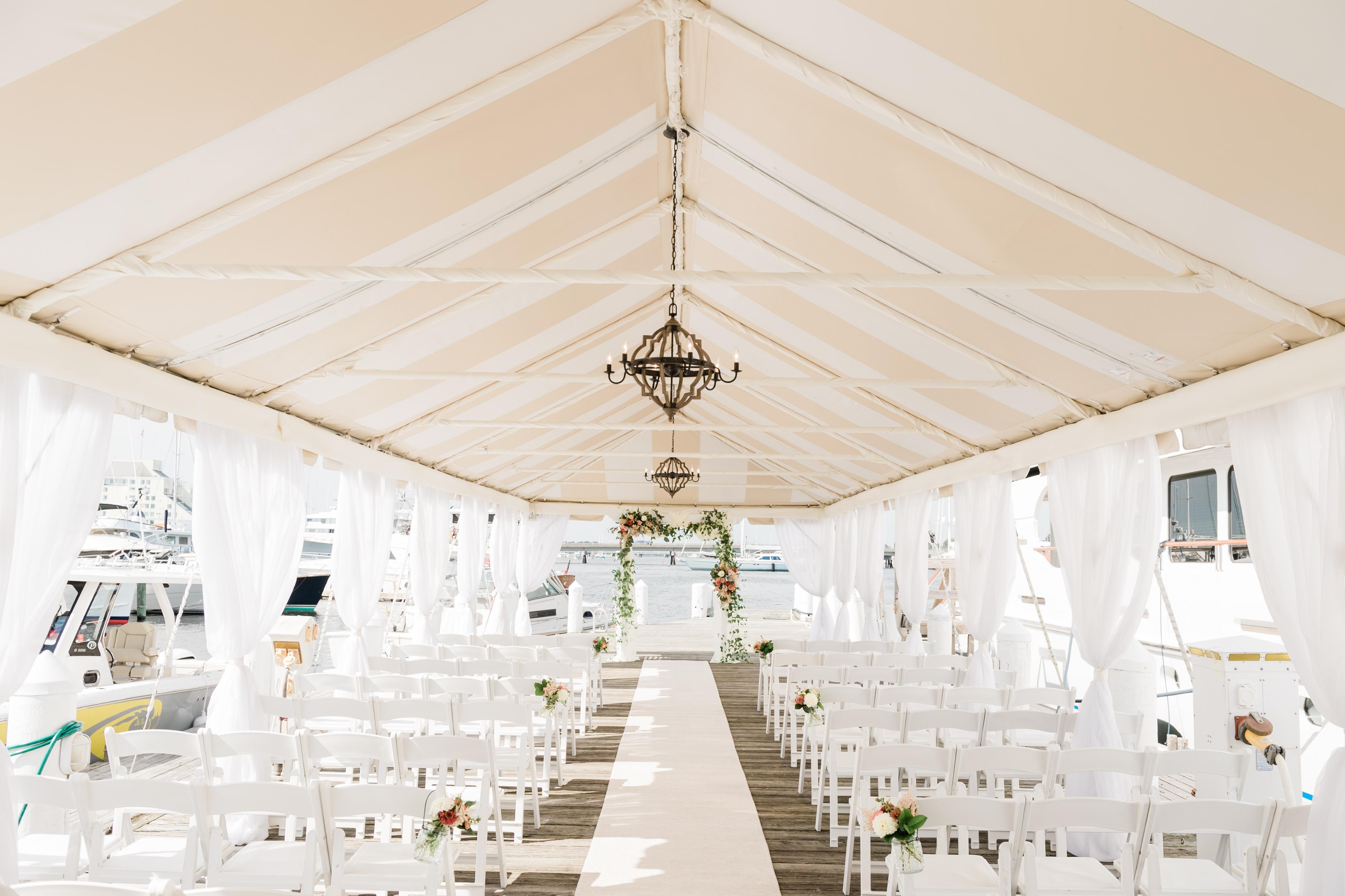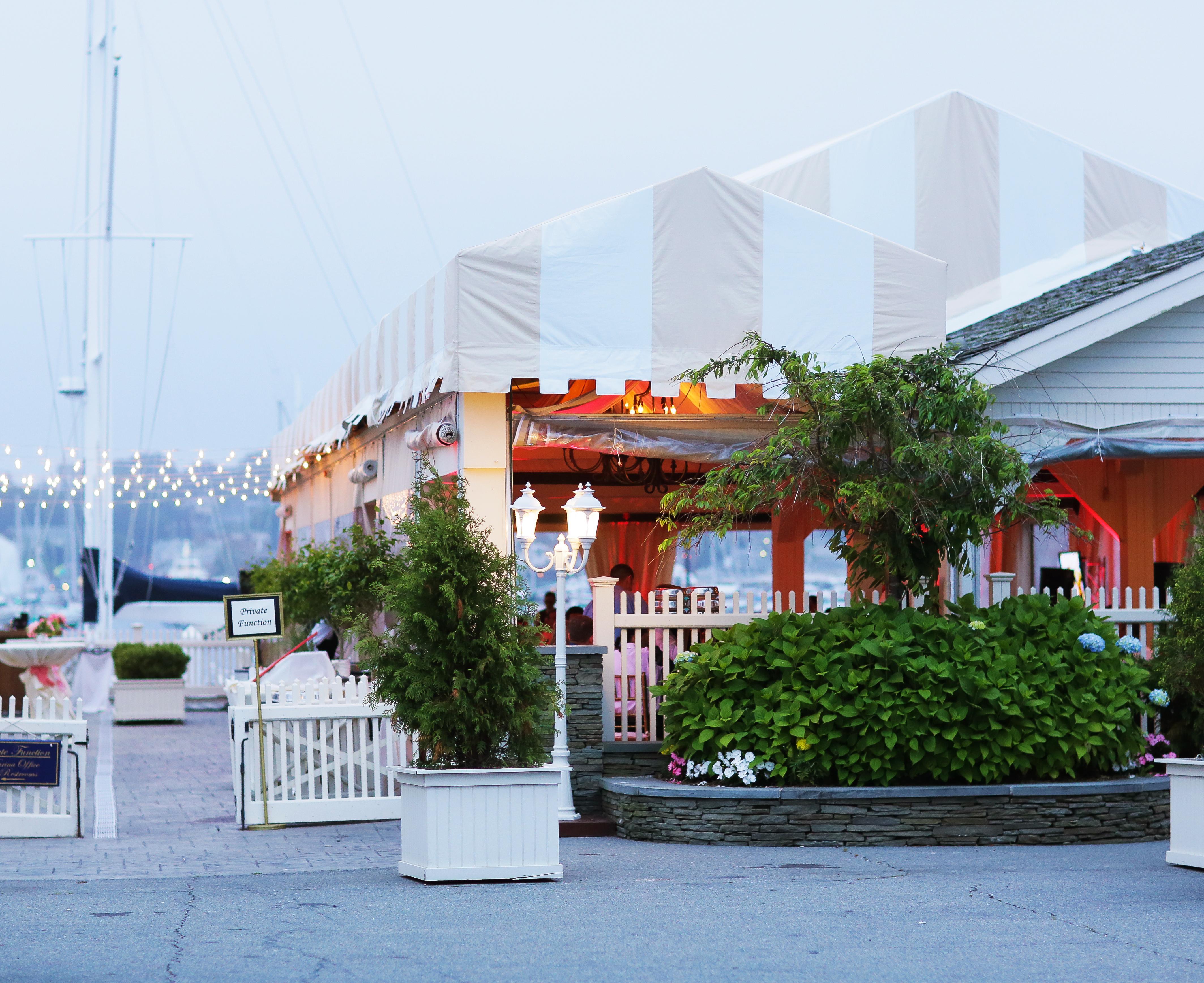 Regatta Place offers a seamless blend of indoor-outdoor elegance, centered around an exquisite cream-and-white striped garden tent. This permanent structure is a masterclass in coastal chic, featuring billowed ceiling draperies and striking chandeliers that create an instant air of romance. The experience extends to a private dockside patio, where guests can enjoy sophisticated cocktails and hors d'oeuvres just steps from the water. Framed by a marina of world-class yachts and panoramic views of Newport Harbor, the space transforms naturally from a sun-drenched day to a starlit evening.