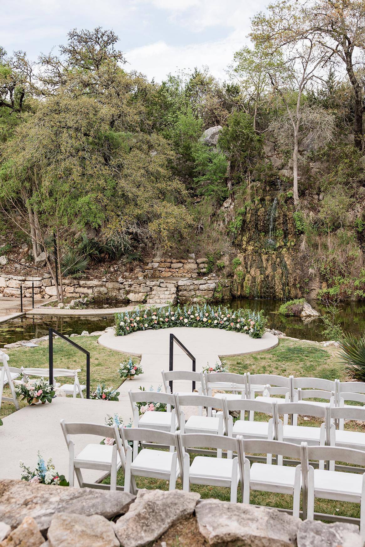 A breathtaking outdoor ceremony site surrounded by water, stone, and woodland beauty