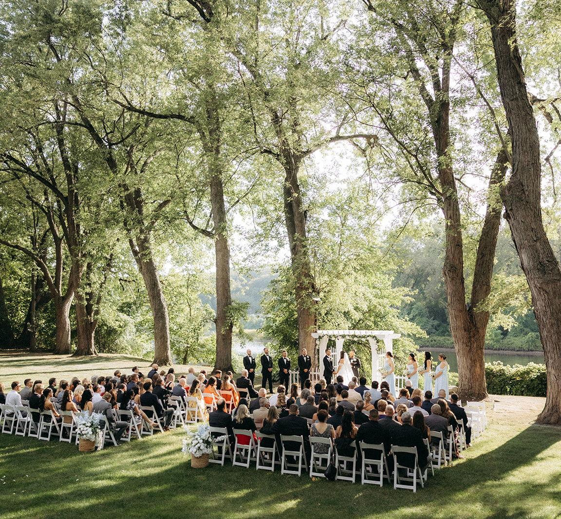 Shaded by a canopy of silver maple trees, the grounds of the Manor offer the perfect location for a romantic outdoor ceremony under the arbor, an elegant cocktail hour, and areas for guests to enjoy. The lush and manicured lawn leads to the romantic outdoor ceremony site along the riverfront. Enjoy expansive water views, the beauty of centuries-old silver maples, and stone walls that add charm and character to the outdoor spaces of our estate.