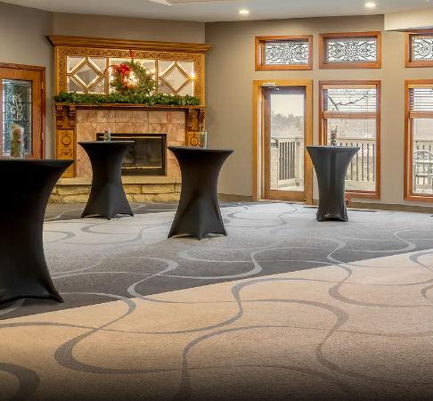 The Renaissance Ballroom at Riverview Inn & Suites is one of our most popular event spaces, offering warmth and timeless charm. Featuring elegant fireplaces, a built-in dance floor, and a beautiful wooden bar, the space creates a welcoming atmosphere for dining, dancing, and celebrating. Its classic design and flexible layout make it an ideal setting for unforgettable weddings and special events in Rockford.