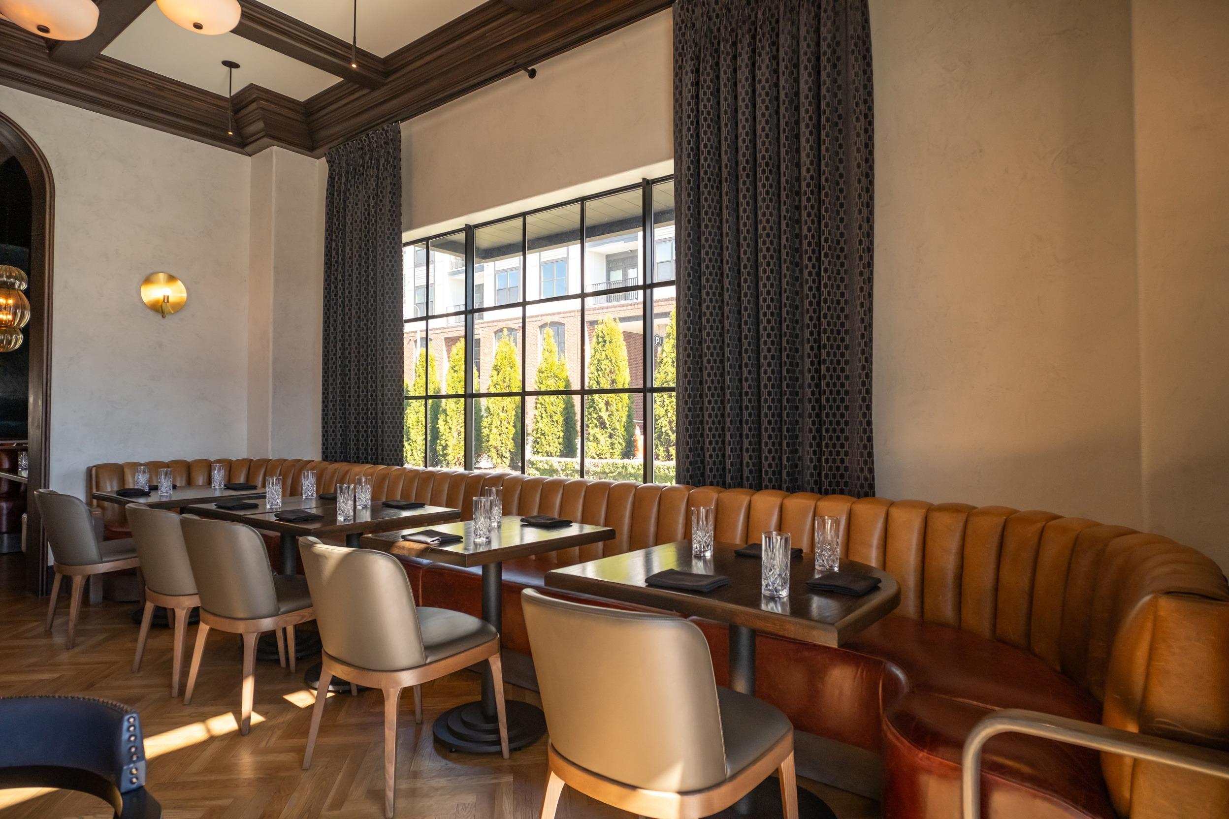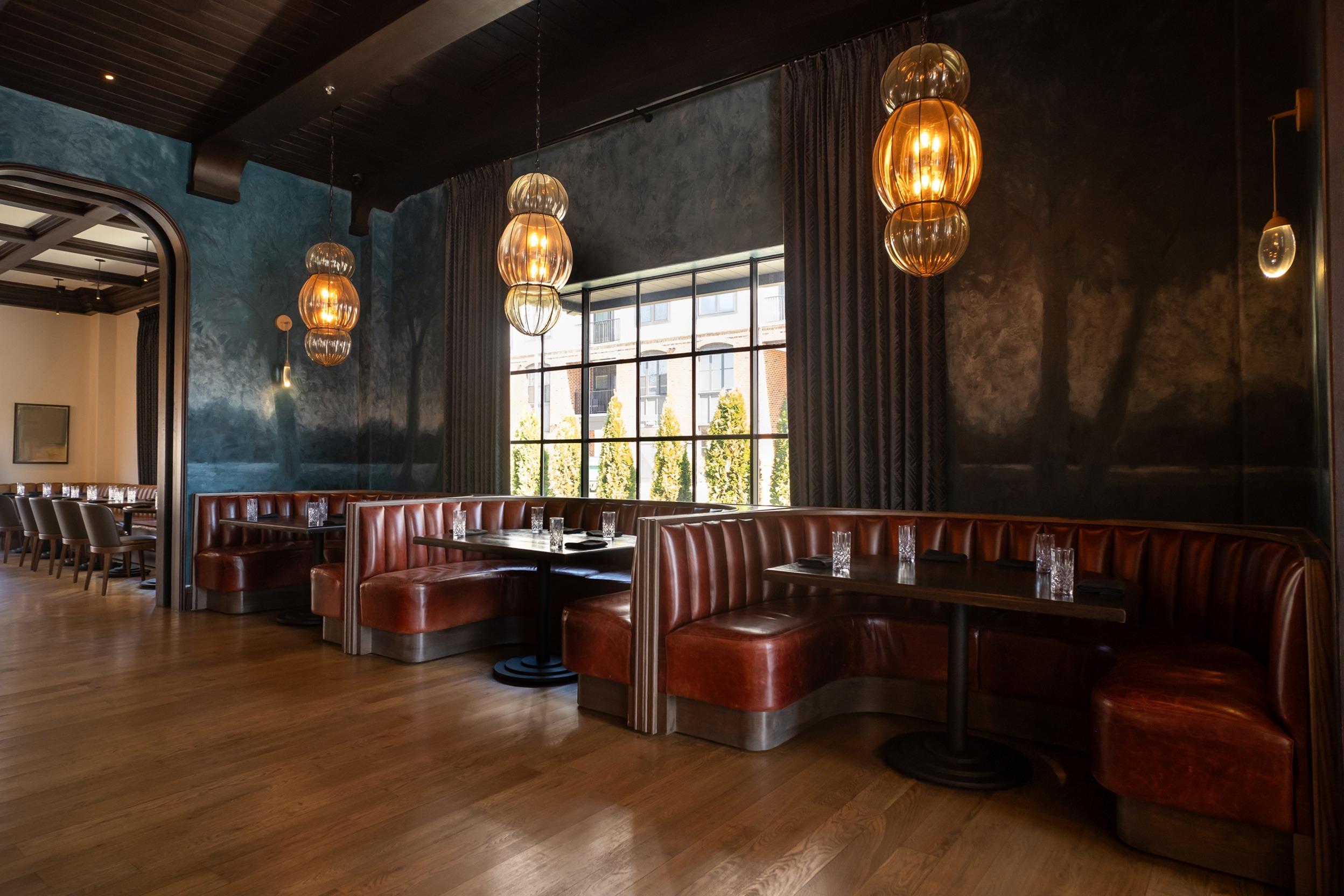 Immerse your guests in a sophisticated atmosphere defined by rich wood paneling and sumptuous leather banquette seating. This intimate space features stunning herringbone wood floors and dramatic, floor-to-ceiling drapes that frame expansive windows. Artfully curated lighting, from glowing orb pendants to modern wall sconces, creates a warm and inviting ambiance perfect for a rehearsal dinner or an upscale cocktail hour. With its deep color palette and refined architectural details, this room offers a timeless backdrop for couples seeking a touch of modern-vintage charm.