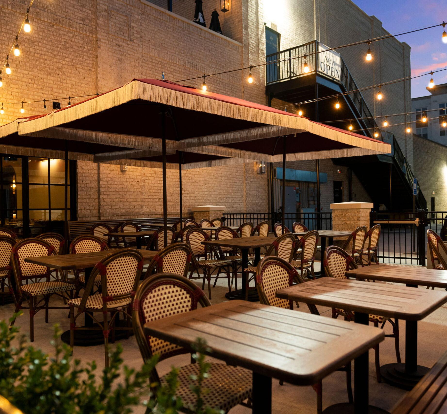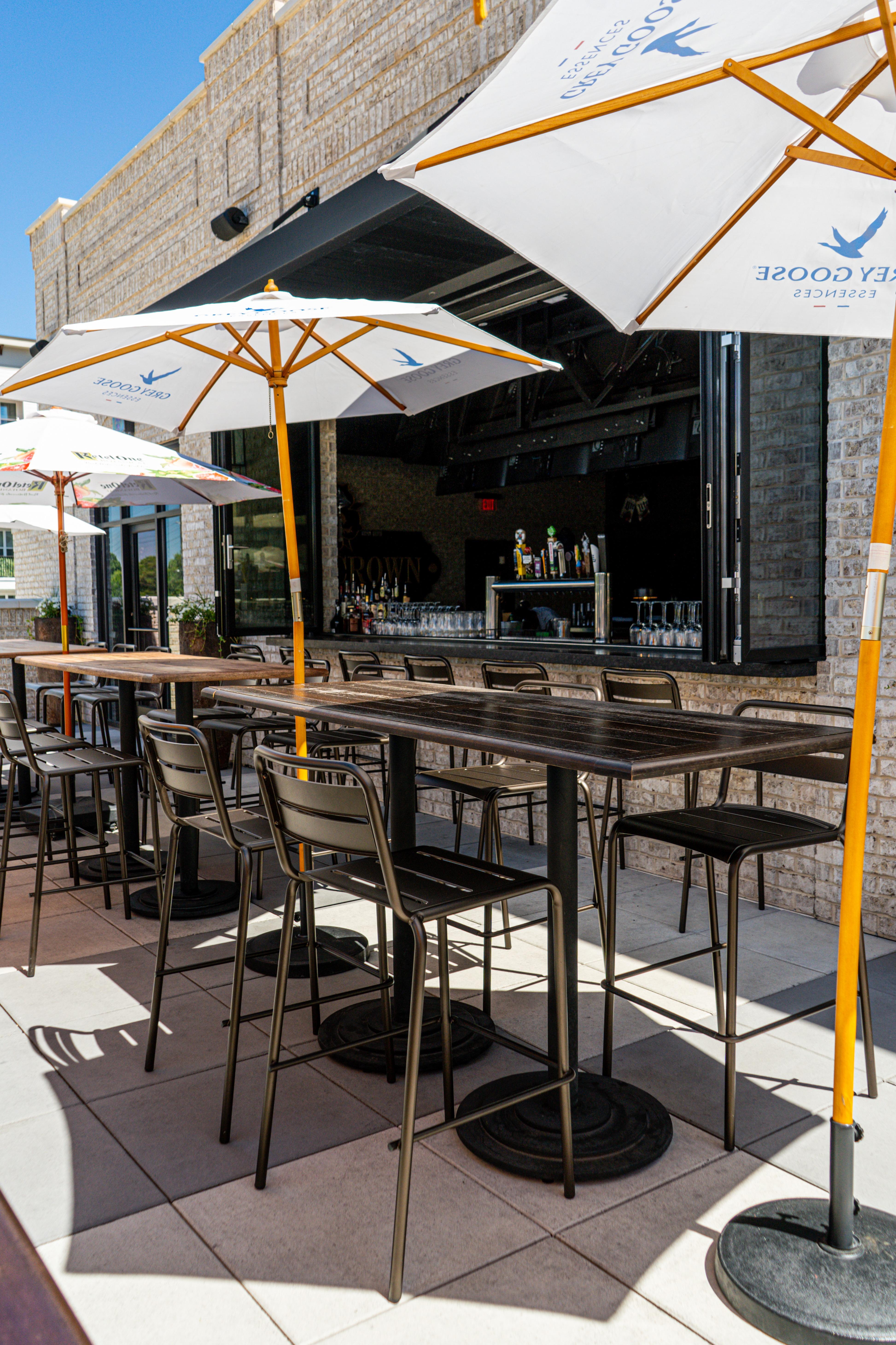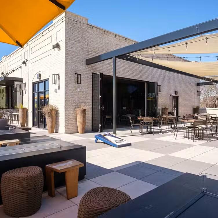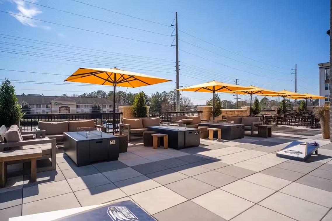 Elevate your wedding celebration on this expansive, modern rooftop patio designed for seamless outdoor entertaining. The space features stylish lounge seating centered around contemporary fire pits, creating a warm and inviting atmosphere as the sun sets. Vibrant umbrellas provide ample shade during the day, while overhead bistro lighting adds a romantic glow for evening festivities. With its clean lines, neutral stone tiling, and open-air breeze, this versatile setting offers a chic backdrop for everything from a spirited cocktail hour to a relaxed wedding brunch.