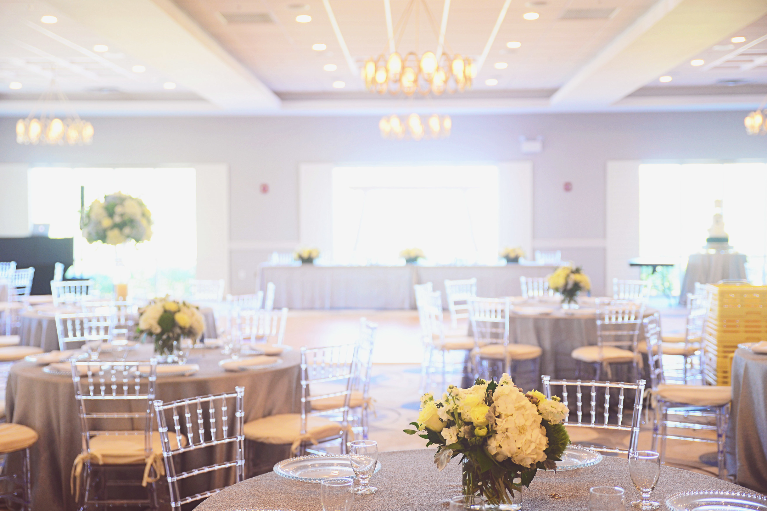 Modern elegance meets timeless style in this expansive ballroom. Bathed in natural light from floor-to-ceiling windows, the room features a neutral palette and sparkling chandeliers that complement any wedding theme. The versatile layout can be used in its entirety for a grand reception or divided into two intimate sections for smaller celebrations. Whether you’re hosting a gala or a seated dinner, the room offers a refined glow and stunning views of the surrounding scenery.