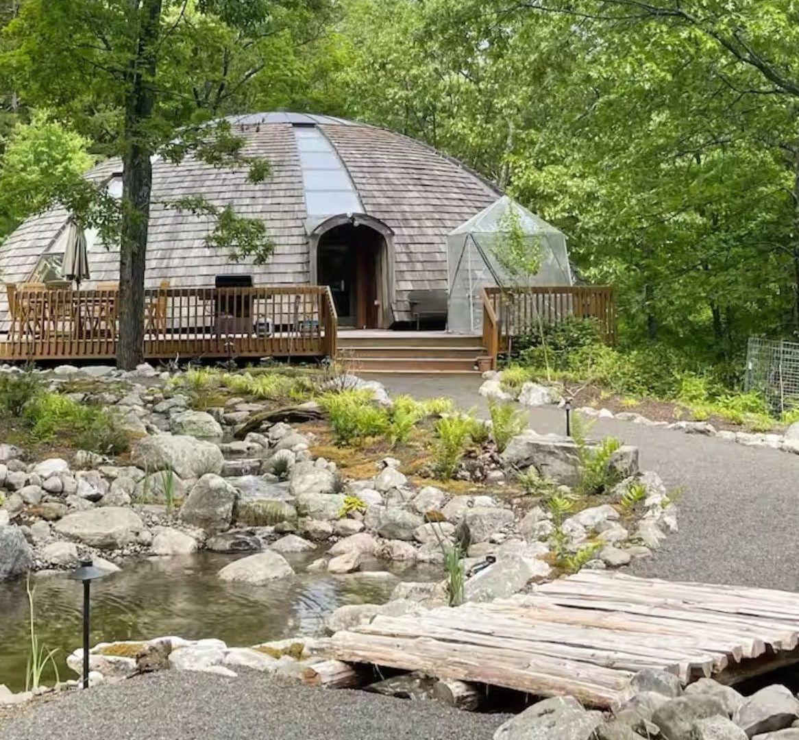 Nestled on 31 acres of private woodland in New Paltz, NY, Round House Farms is a one-of-a-kind estate featuring an architectural dome home, originally designed by French architects, and a spacious four-story house. Floor-to-ceiling windows bathe the Dome in golden light throughout the day, creating a setting that feels both cinematic and deeply intimate. Two hot tubs, a sauna, fire pits, koi pond, and woodland trails complete the experience. Outdoor catering welcome. Sleeps up to 20. 90 minutes from NYC.